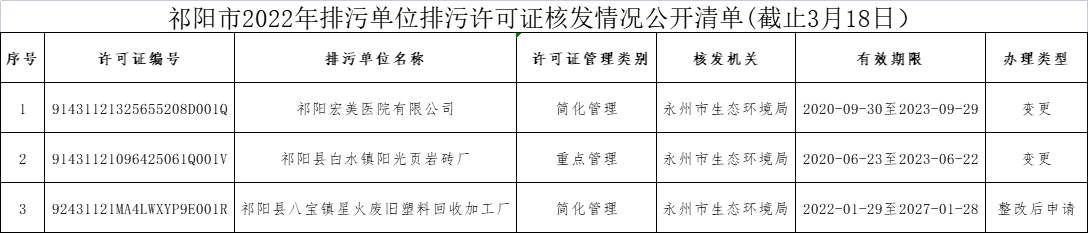 祁阳市2022年排污单位排污许可证核发情况公开清单