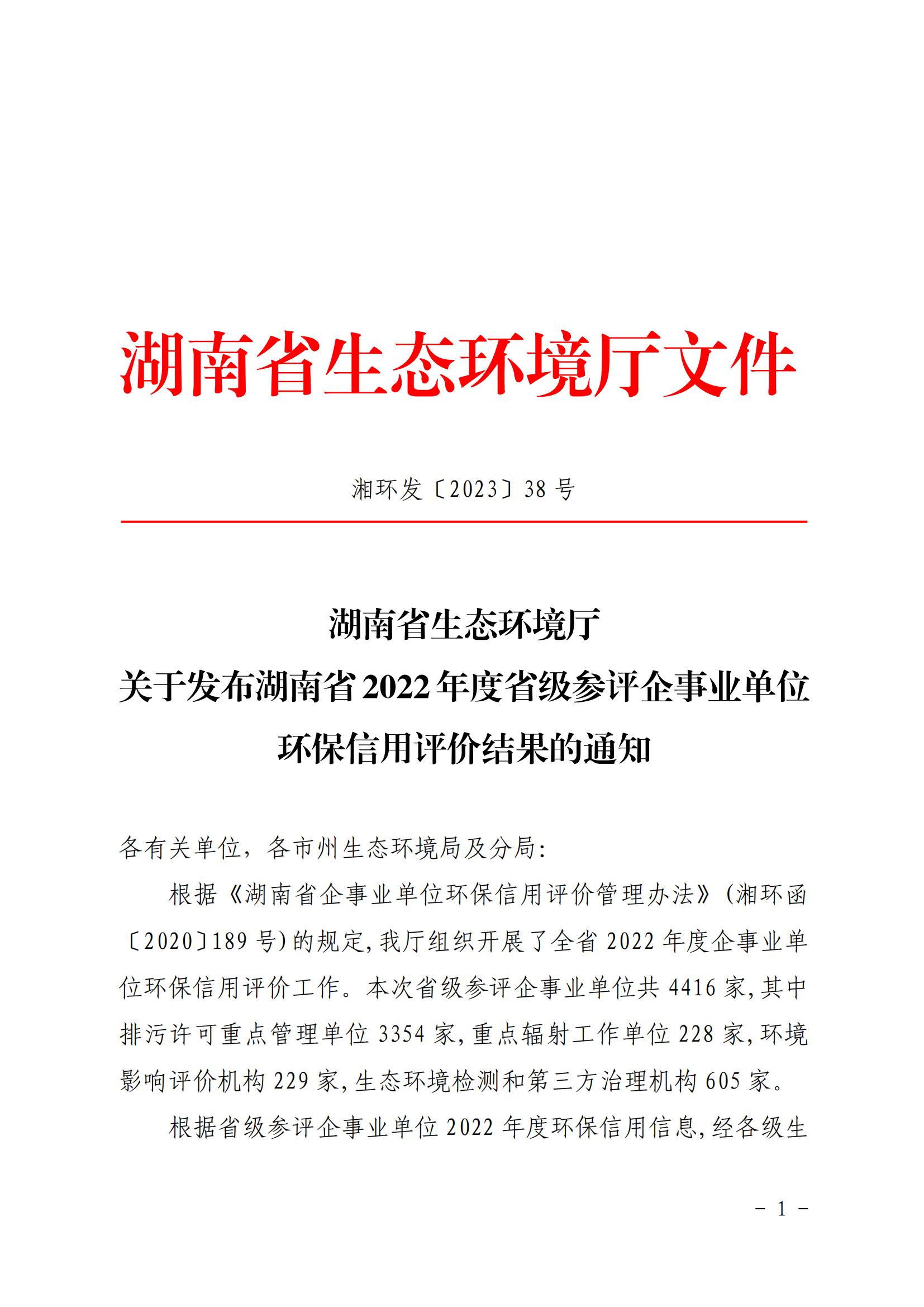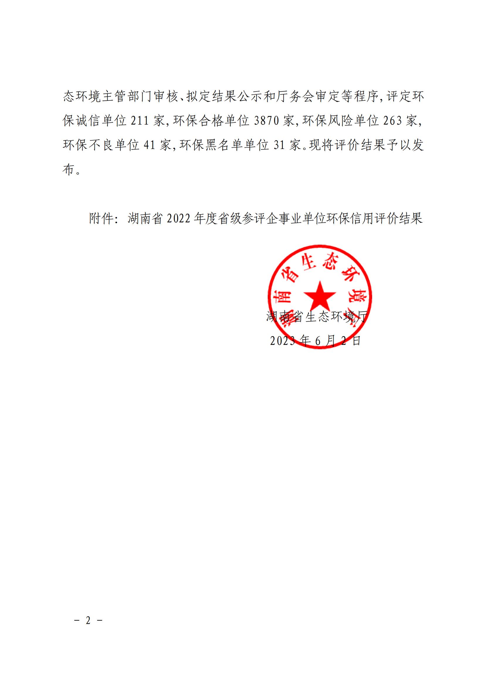 湖南省生态环境厅关于发布湖南省2022年度省级参评企事业单位环保信用评价结果的通知