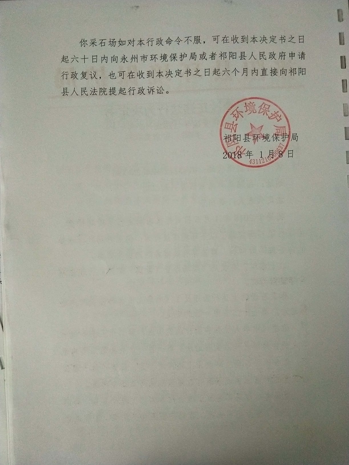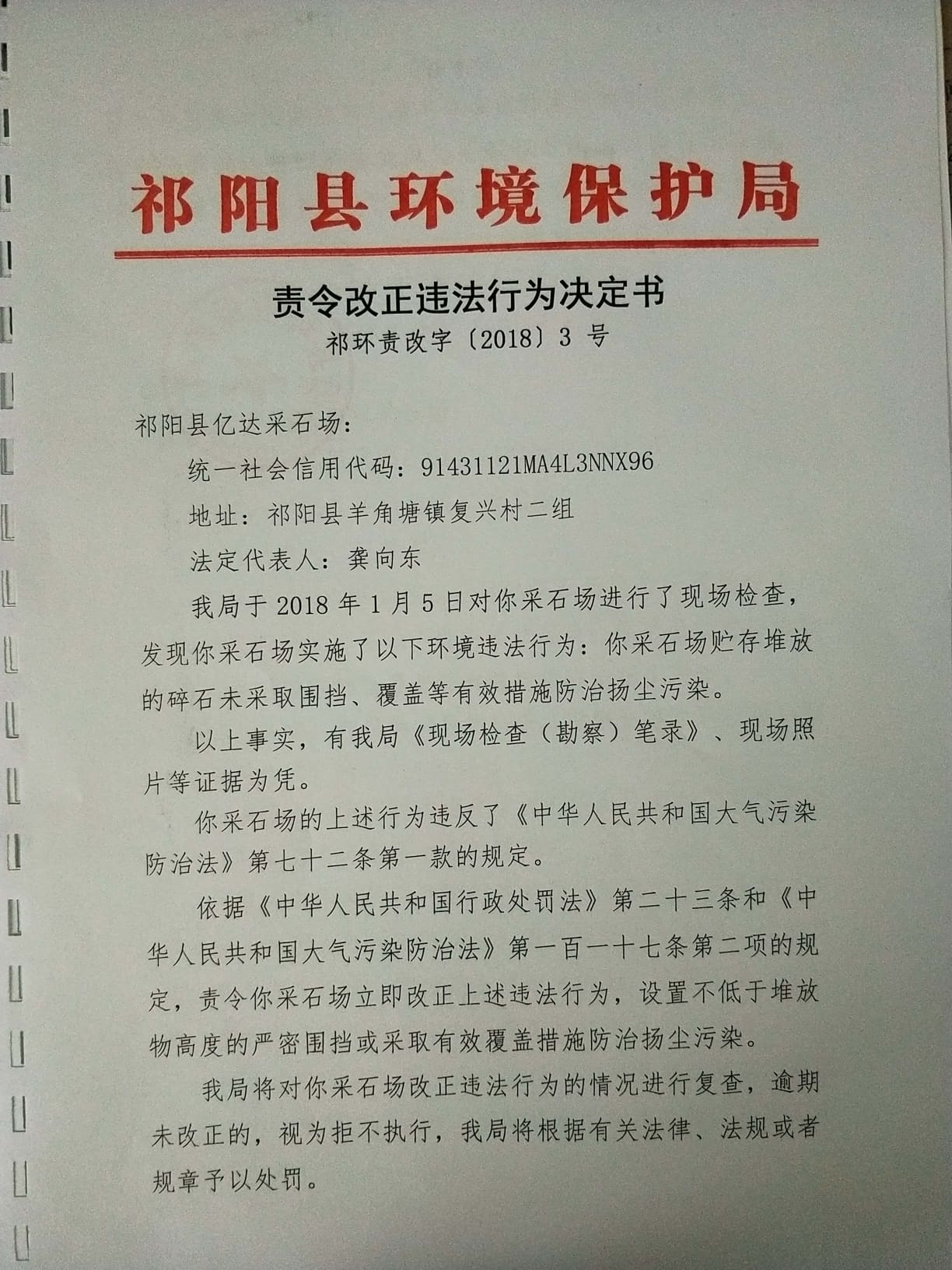 祁阳县羊角塘镇中意采石场责令改正违法行为决定书