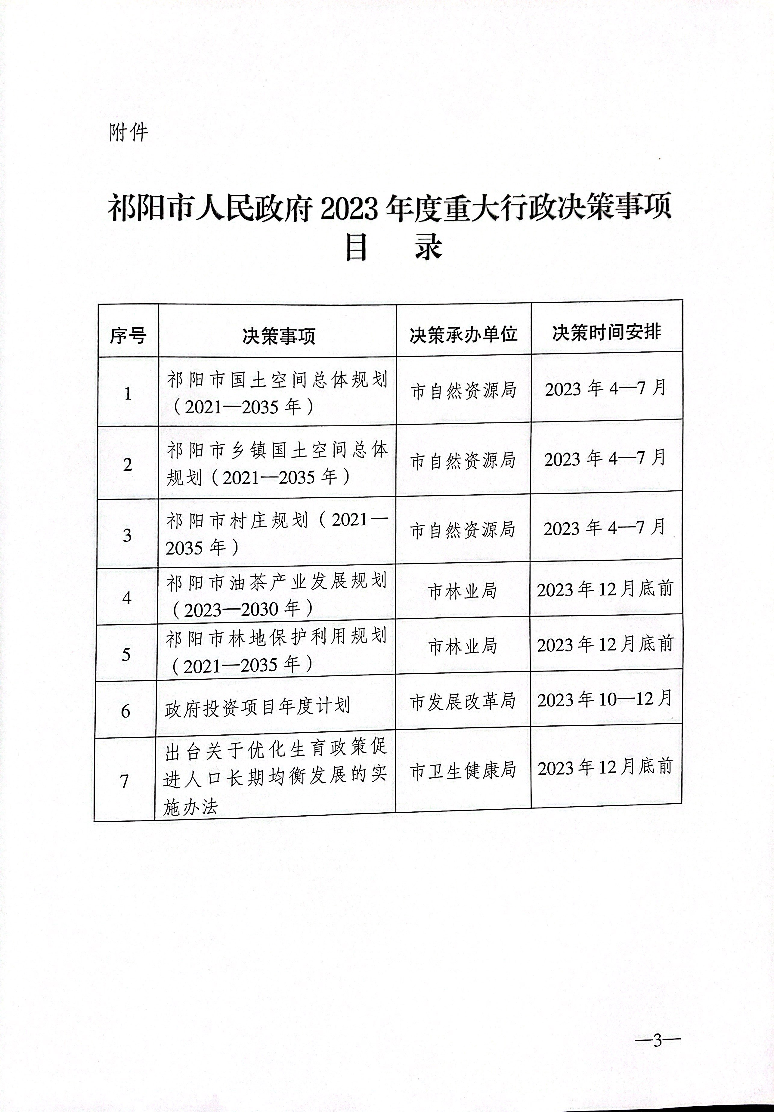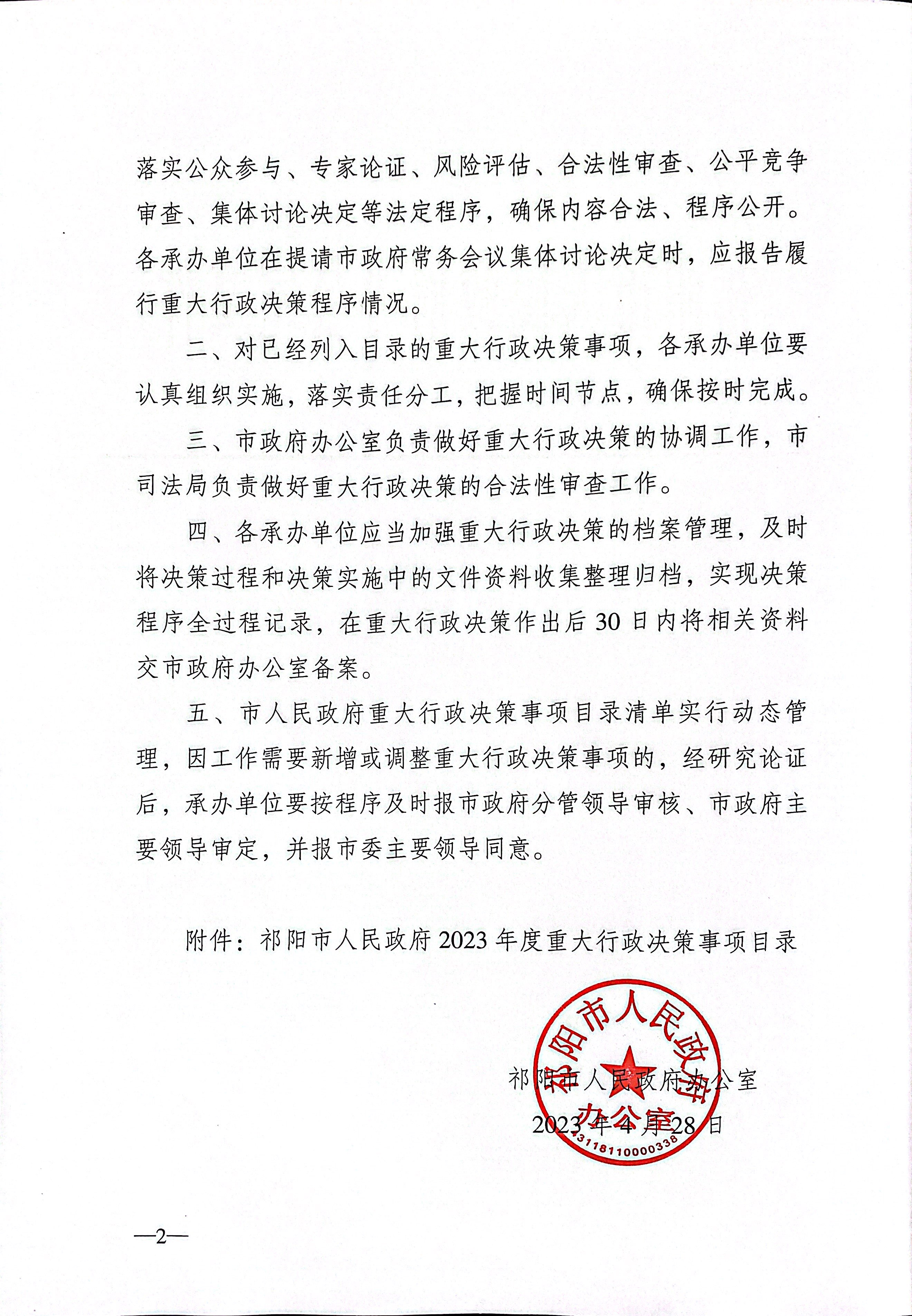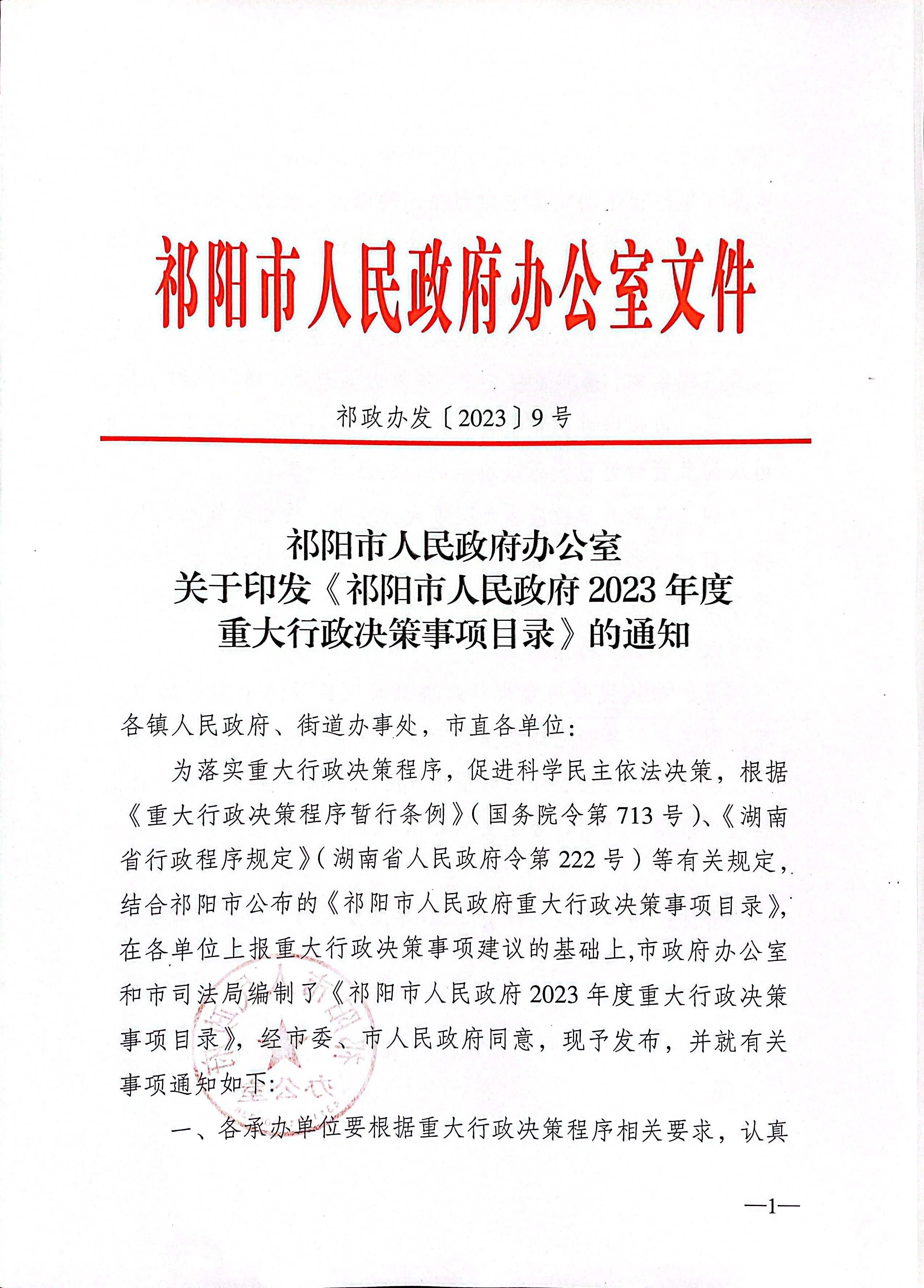 祁阳市人民政府办公室关于印发《祁阳市人民政府2023年度重大行政决策事项目录》的通知
