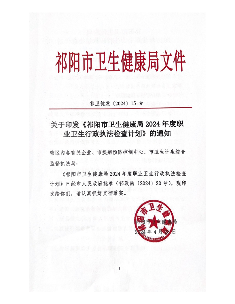 关于印发《祁阳市卫生健康局2024年度职业卫生行政执法检查计划》的通知