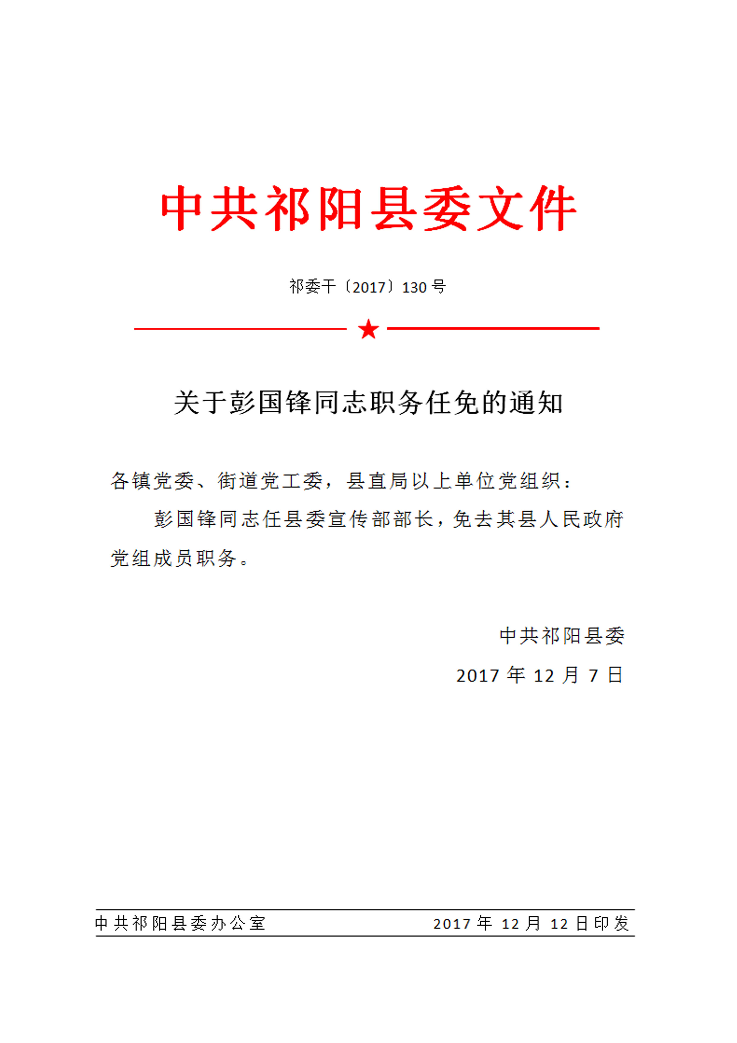 关于彭国锋同志职务任免的通知
