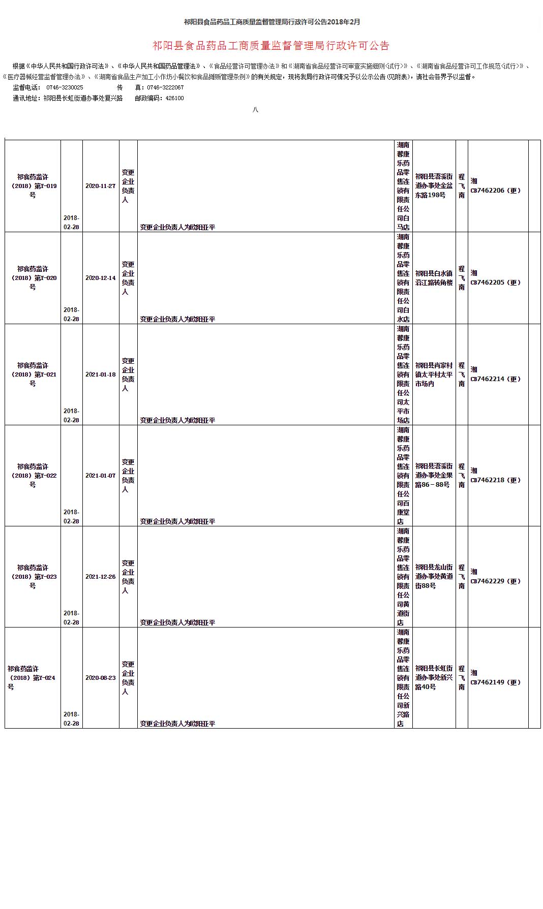 祁阳县食品药品工商质量监督管理局行政许可公告2018年2月 (八)