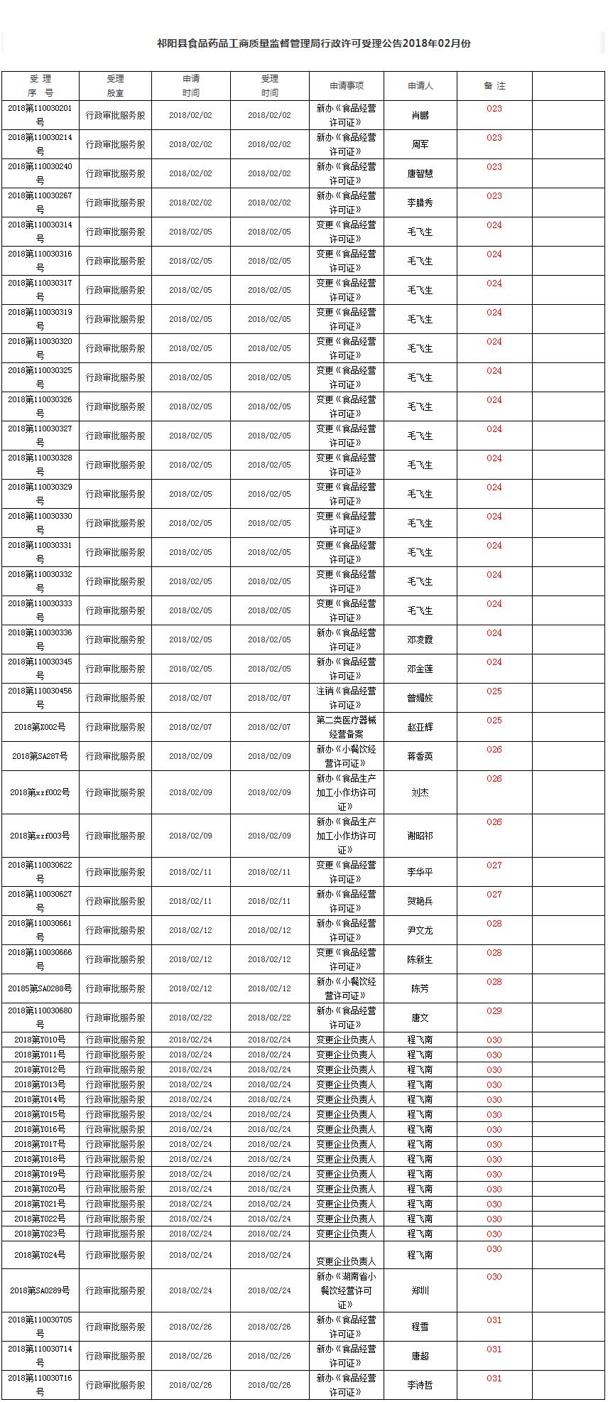 祁阳县食品药品工商质量监督管理局行政许可受理公告2018年02月份