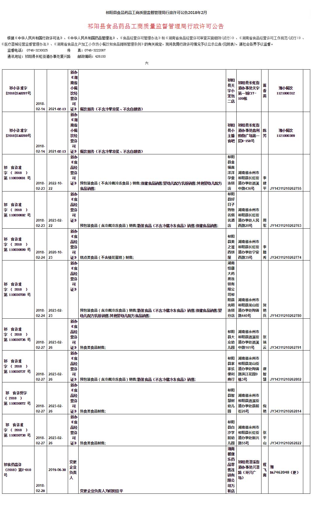 祁阳县食品药品工商质量监督管理局行政许可公告2018年2月 (七)