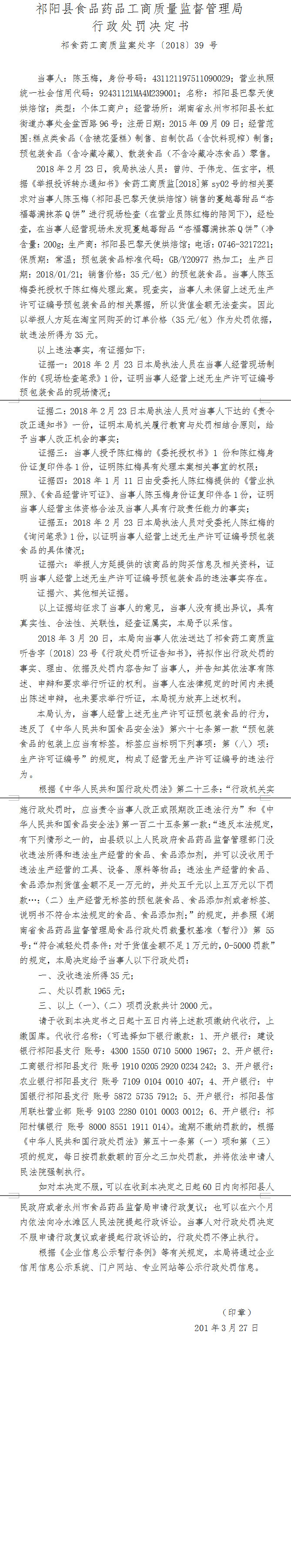 (行政处罚决定书)祁食药工商质监案处字〔2018〕39 号