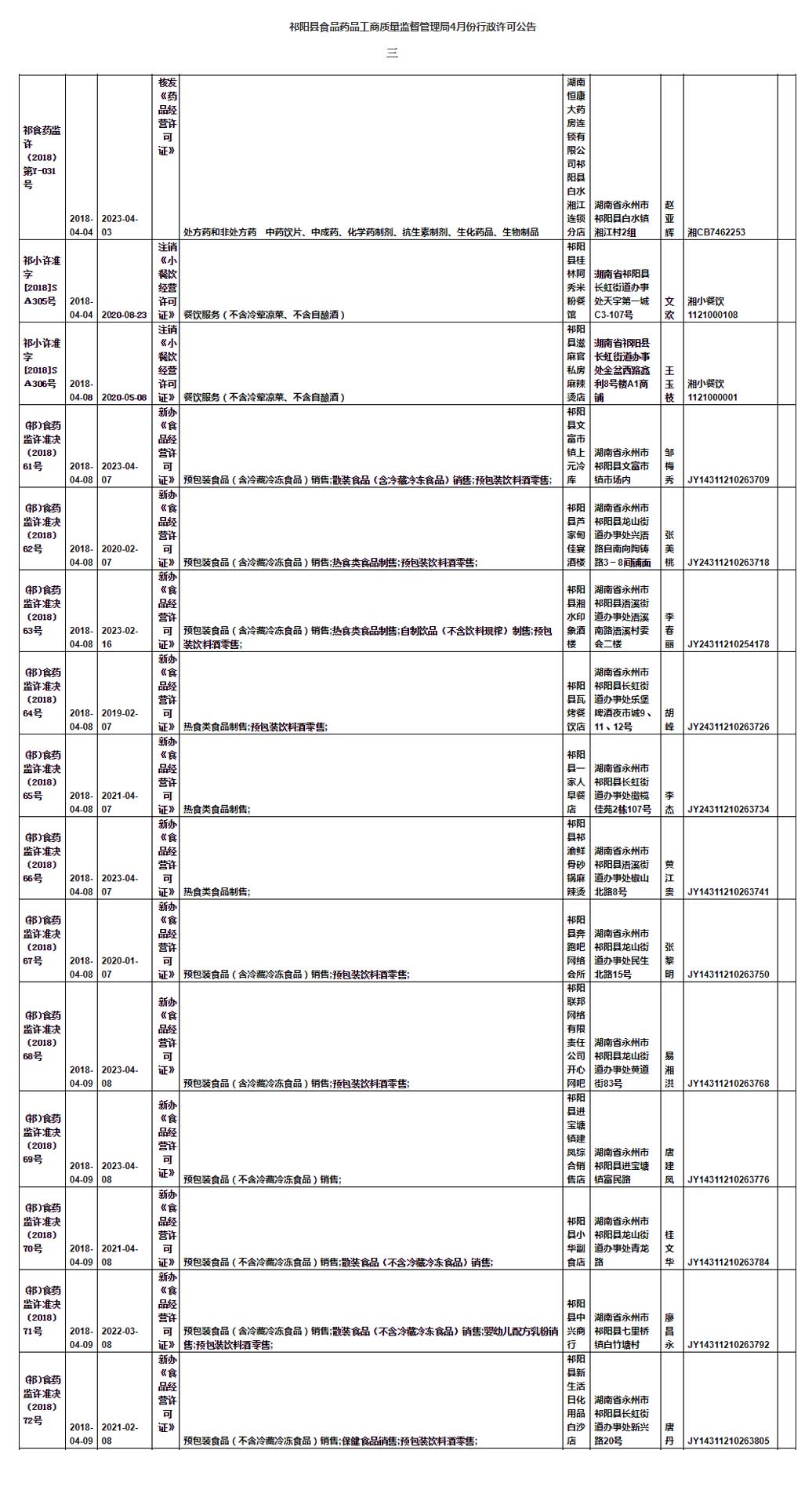 祁阳县食品药品工商质量监督管理局4月份行政许可公告(四)