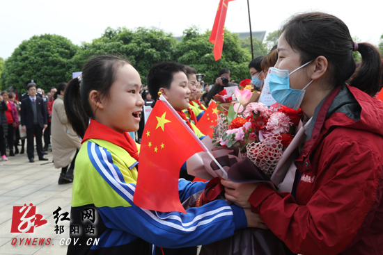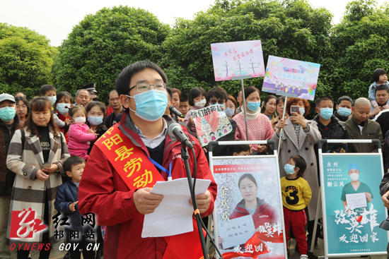 欢迎仪式上,少先队员们向医疗队成员敬礼献花。县人民医院医生周勇代表医疗队汇报驰援湖北医疗工作开展情况,他表示,未来医疗队将继续发扬逆行出征驰援湖北抗疫的大无畏精神,用实际行动践行医者誓言,以更扎实的工作成效为建设幸福美丽新祁阳做出更大贡献。仪式上还为医疗队成员颁发了劳动模范证书。