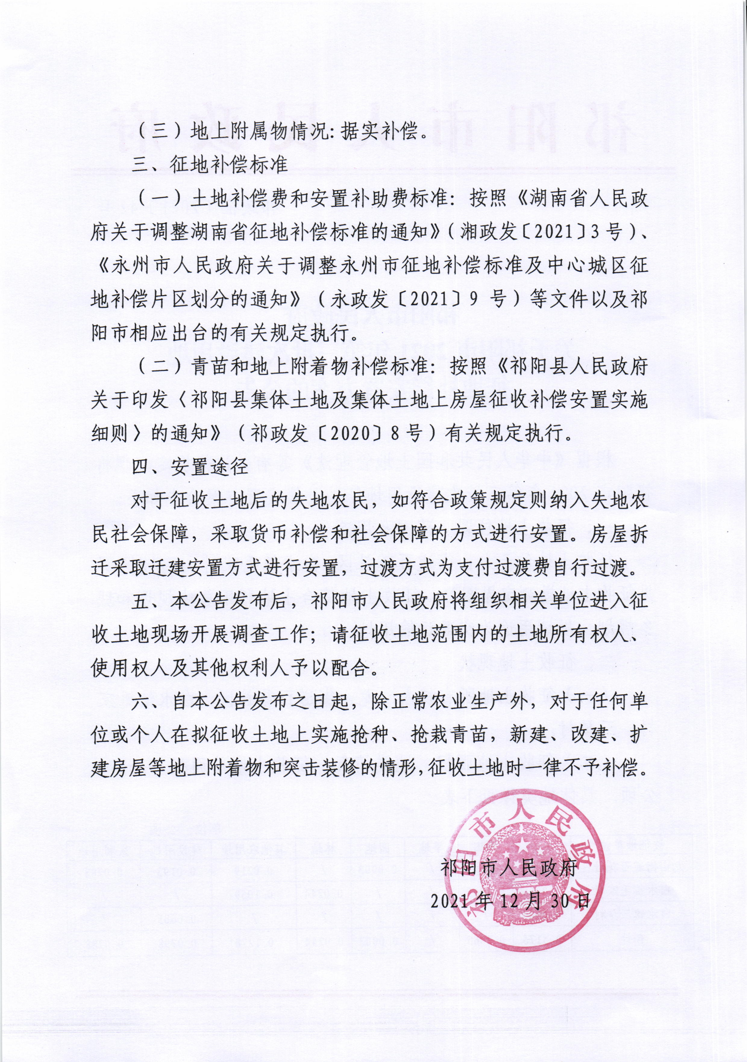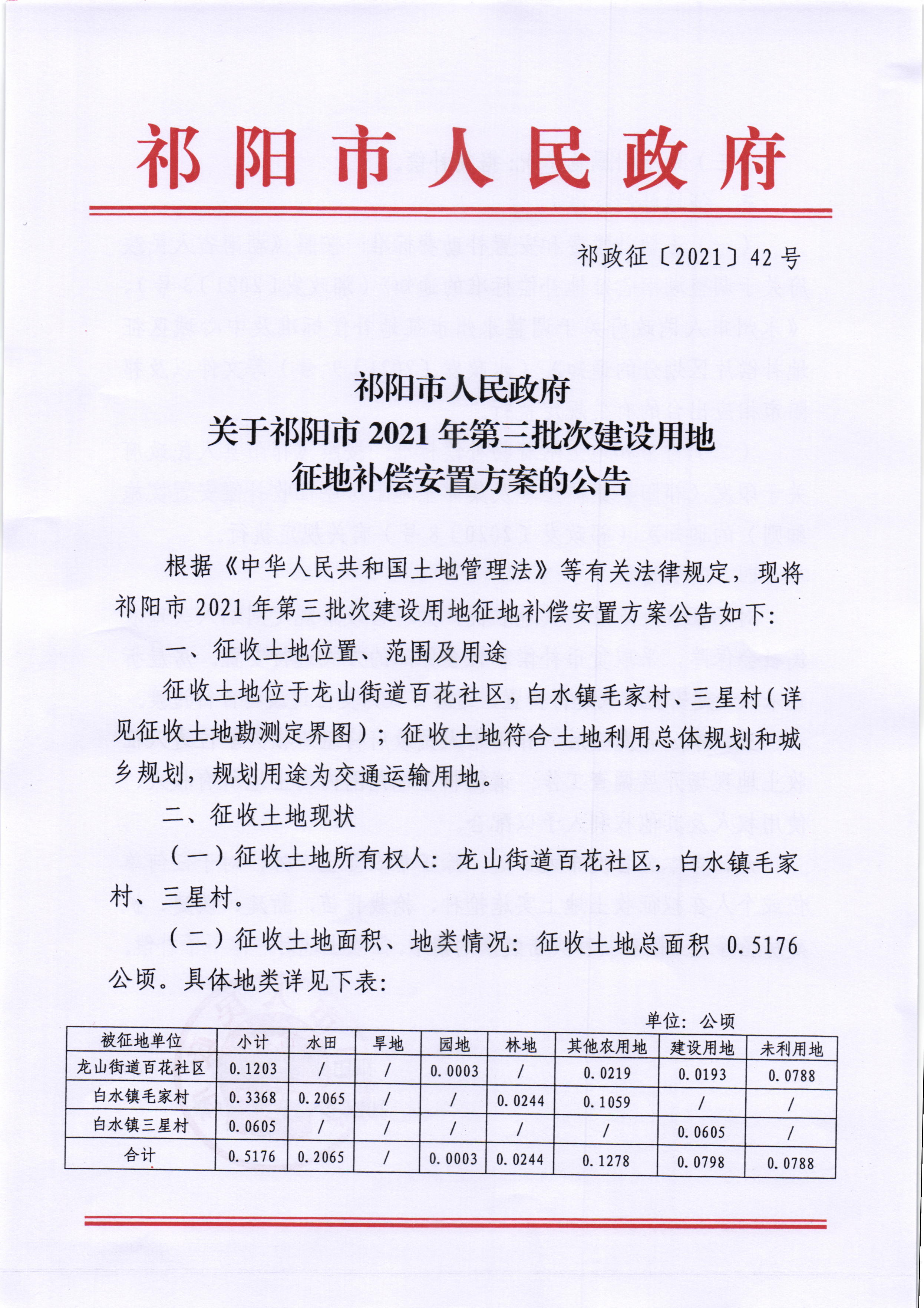 祁阳市人民政府关于祁阳市2021年第三批次建设用地征地补偿安置方案的公告