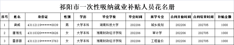我市湖南浯溪发展集团有限公司吸纳龚威、唐湘龙、雷彦薇3位毕业年度高校毕业生就业,现申请一次性吸纳就业补贴。根据省人力资源和社会保障厅、湖南省财政厅、国家税务总局湖南省税务局关于印发《稳岗位提技能保就业十六条措施》的通知(湘人社规〔2022〕19号)精神要求,现将这3人享受一性吸纳就业补贴的相关信息予以公示,如有异议,请拨打举报电话反映情况,接受实名举报。