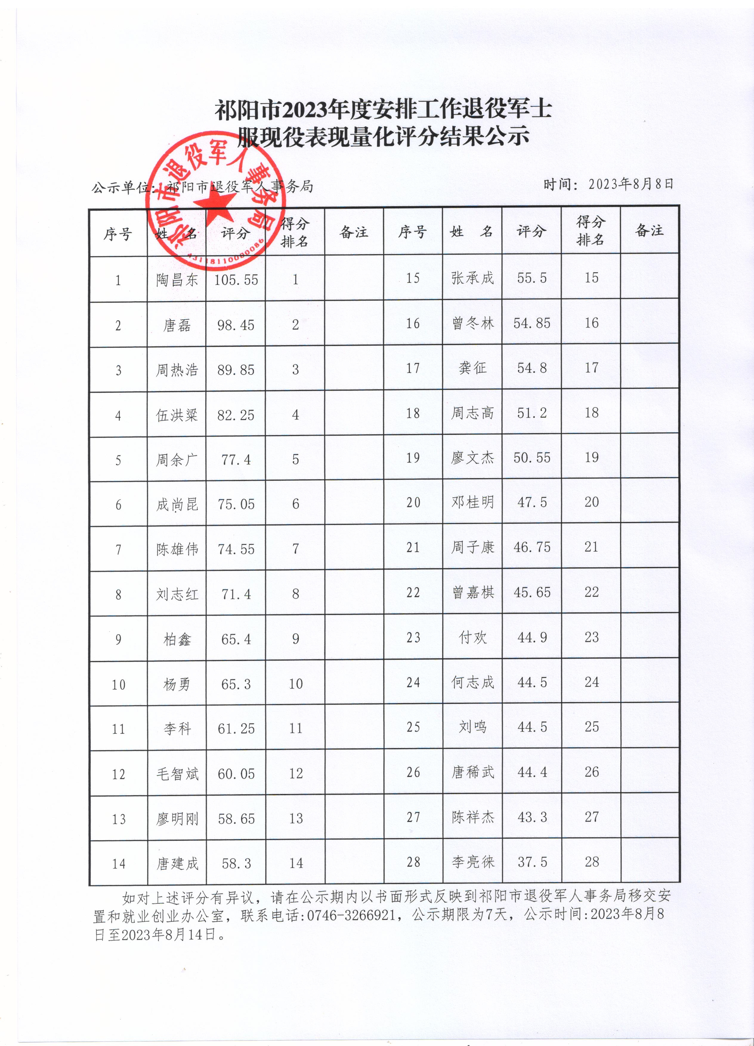 祁阳市2023年度安排工作退役军士服现役表现量化评分结果公示