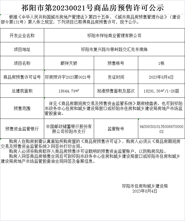 祁阳市第20230021号商品房预售许可公示