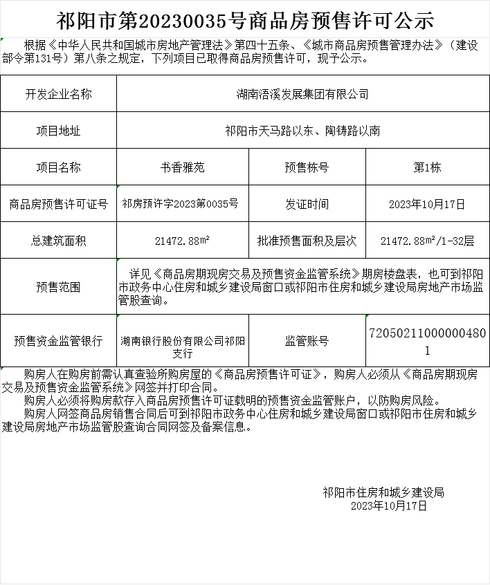 祁阳市第20230035号商品房预售许可公示