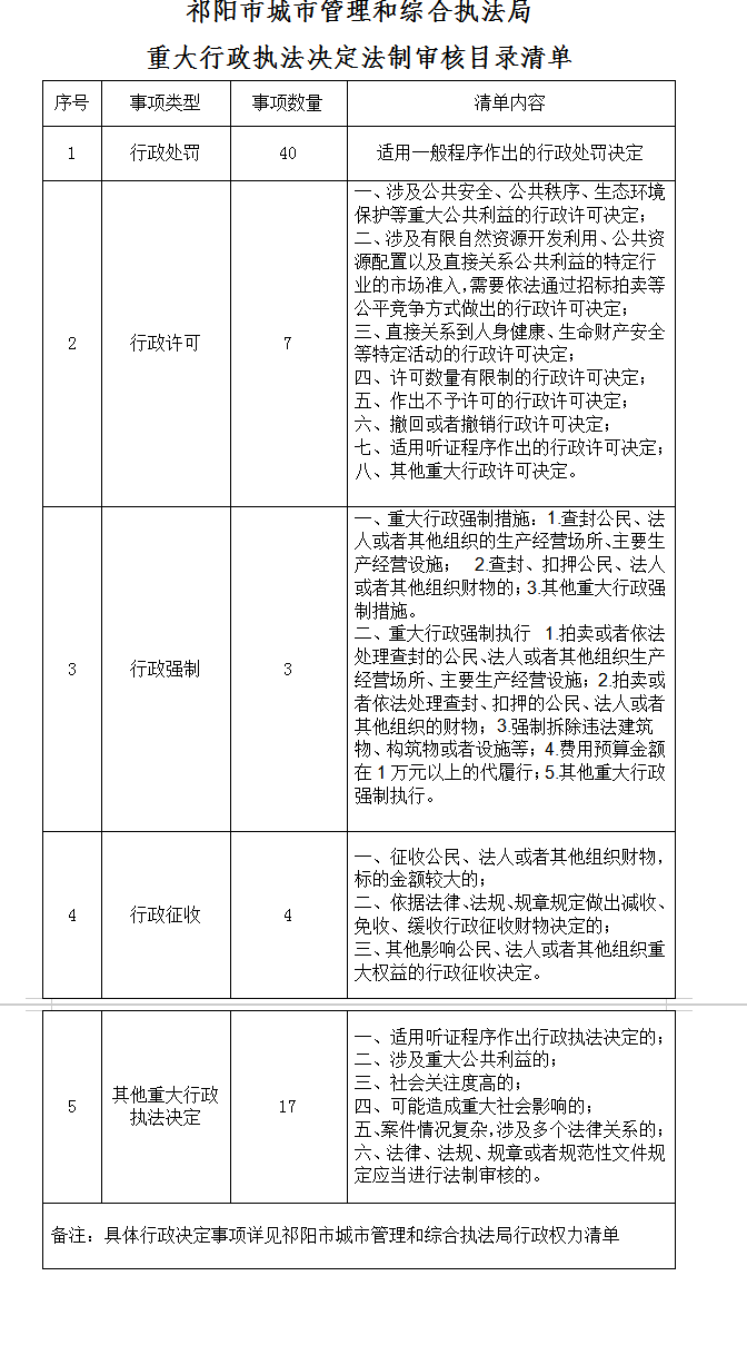 祁阳市城市管理和综合执法局重大行政执法决定法制审核目录清单