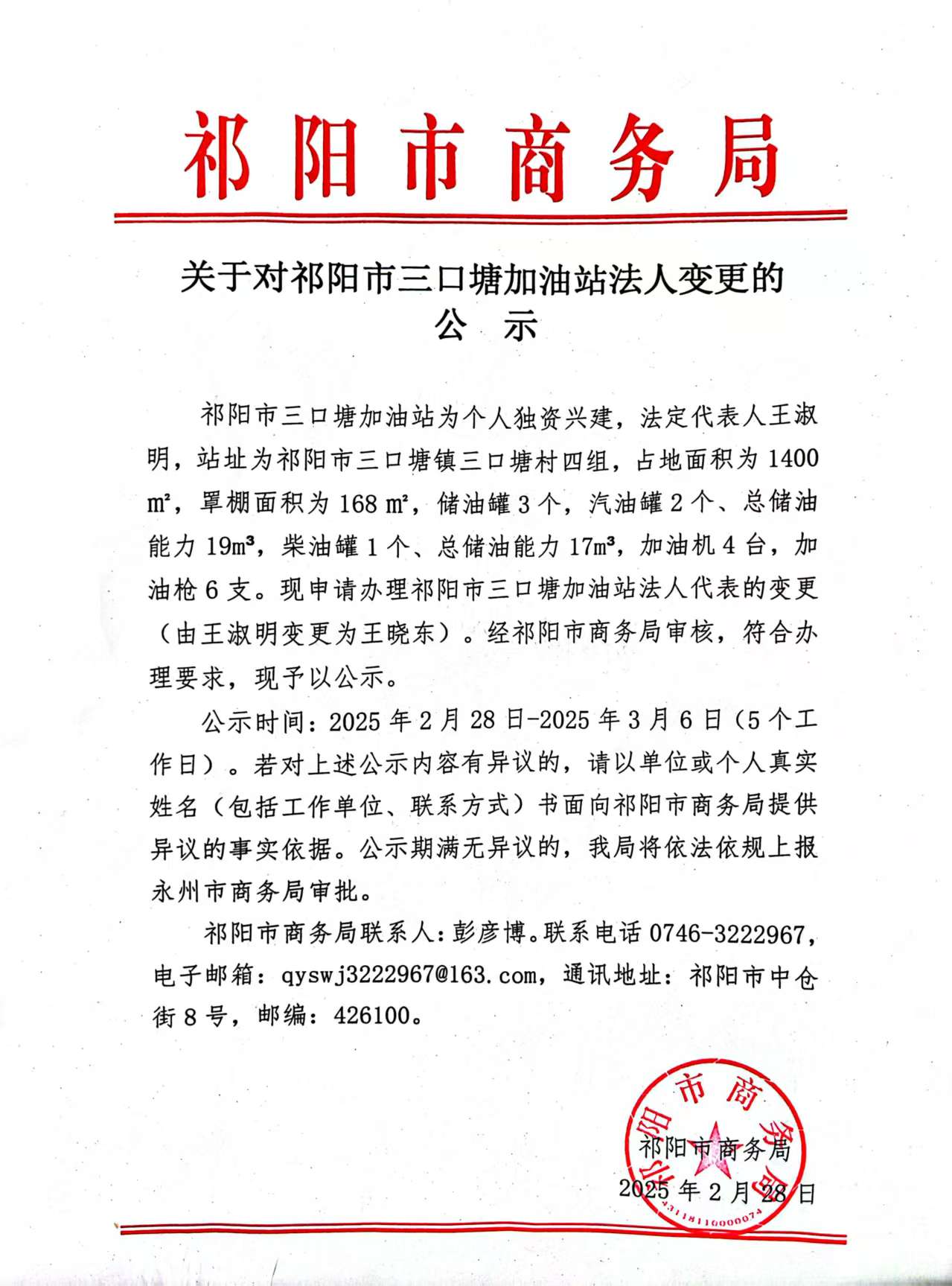 关于对祁阳市三口塘镇加油站法人代表变更的公示
