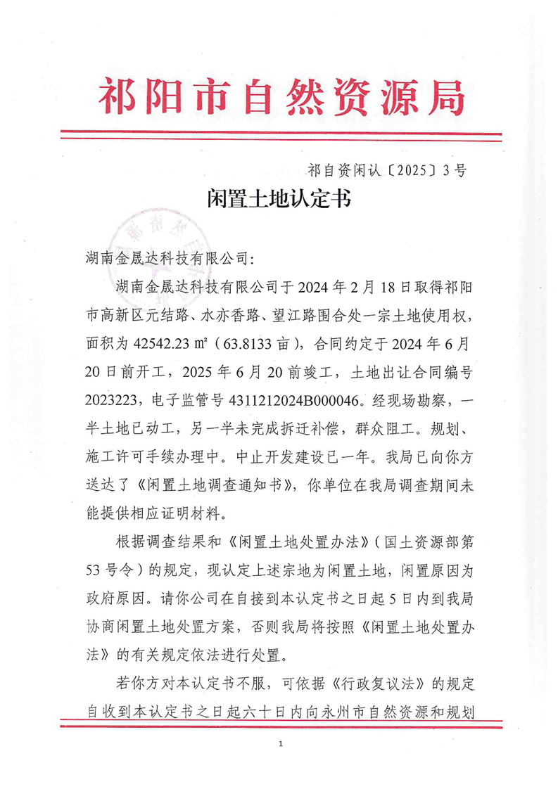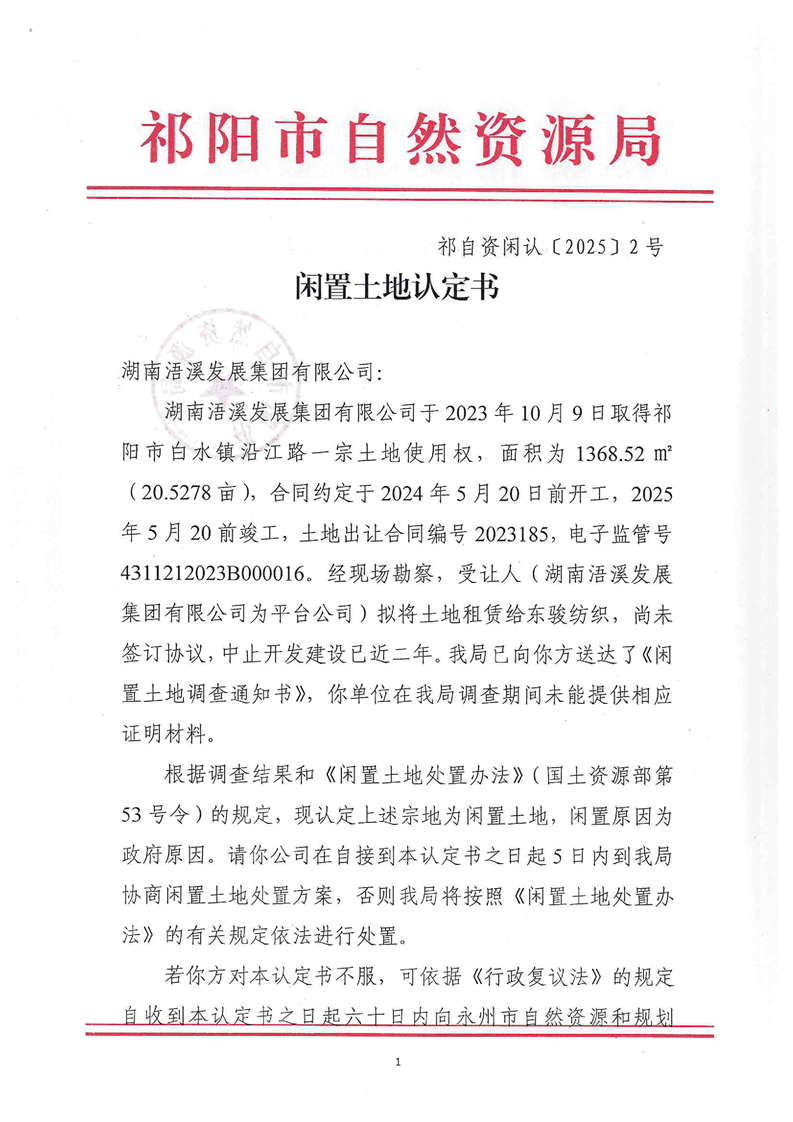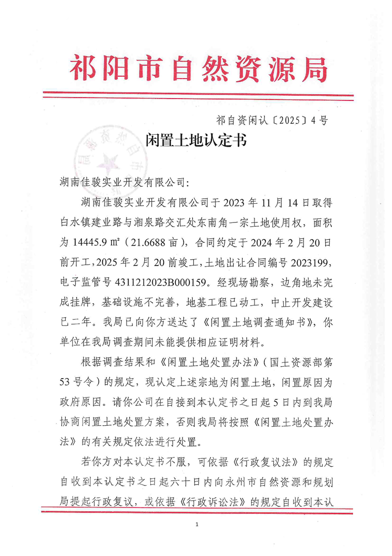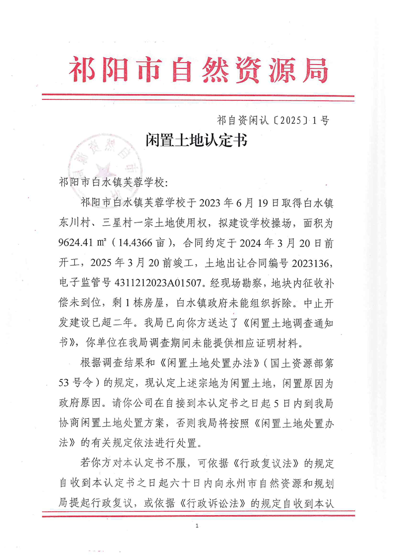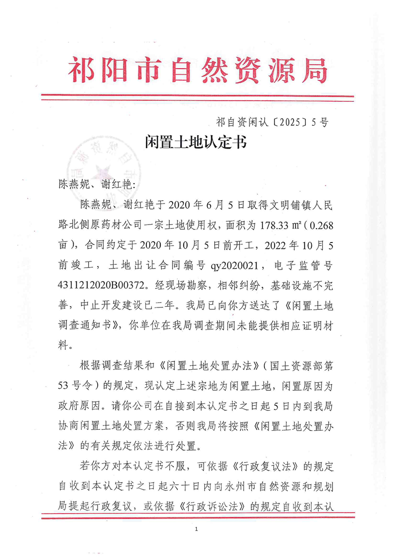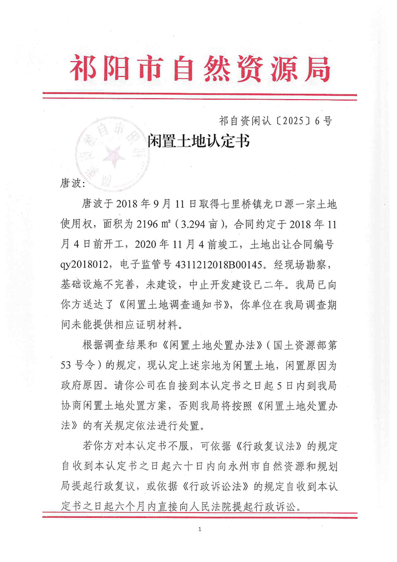 闲置土地认定书 祁自资闲认〔2025〕1号—6号