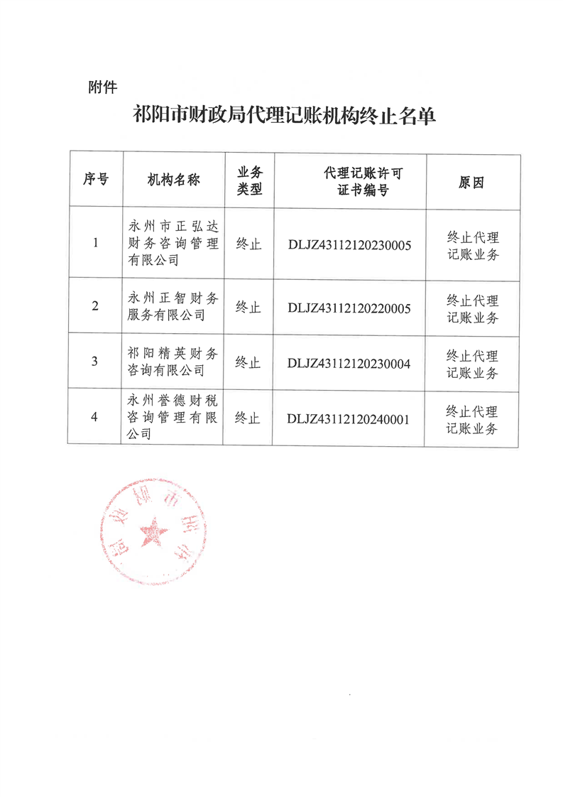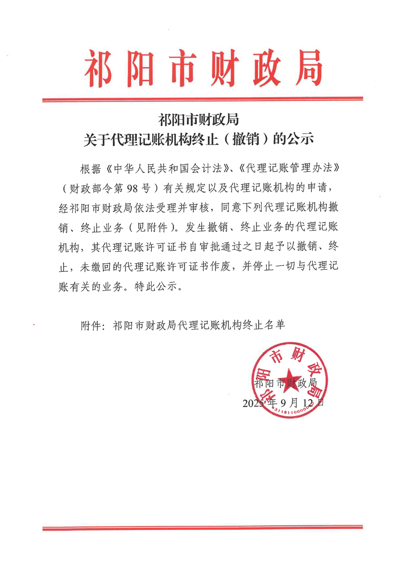 祁阳市财政局关于代理记账机构终止(撤销)的公示