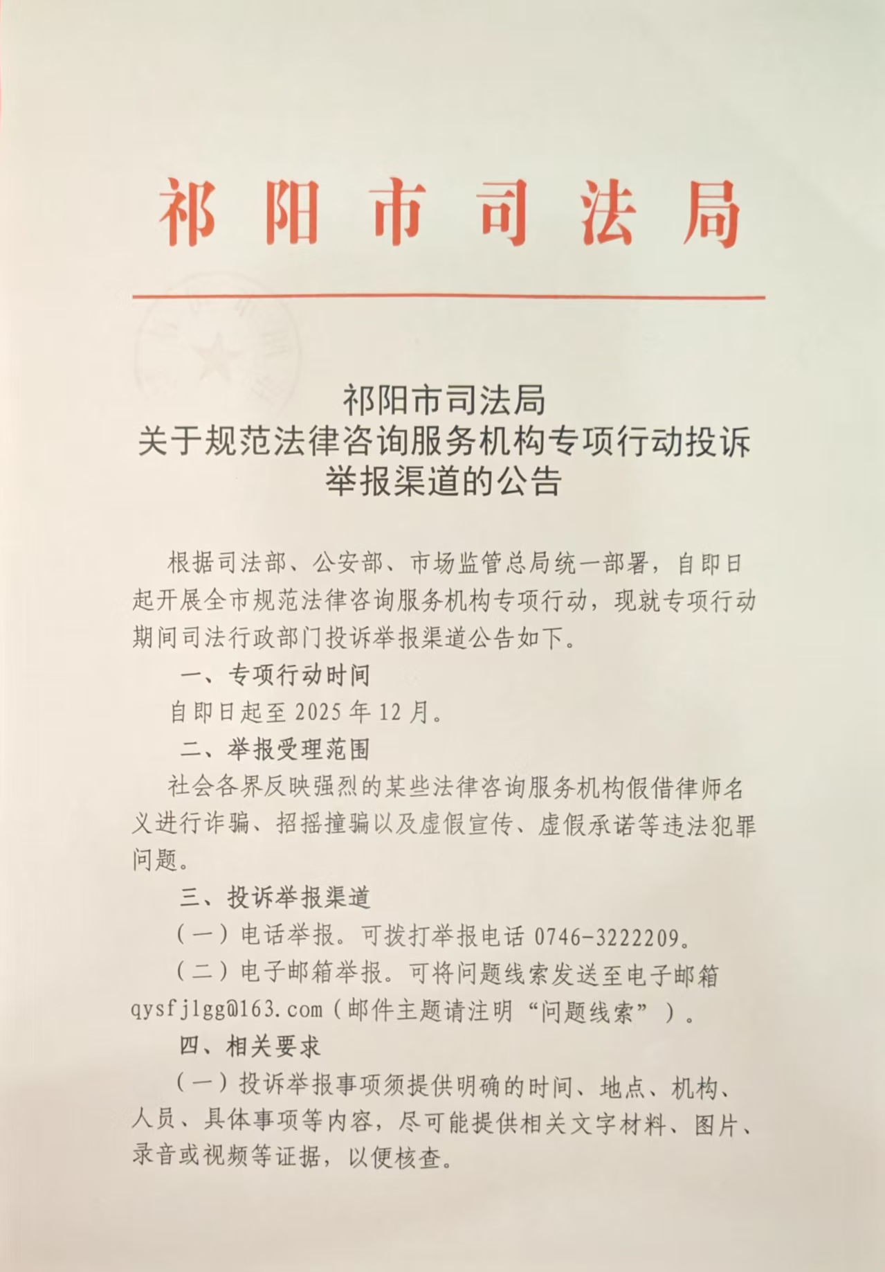 关于规范法律咨询服务机构专项行动投诉举报渠道的公告