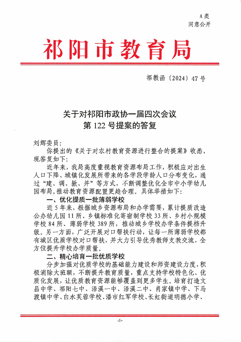 祁教函〔2024〕47号 关于对祁阳市政协一届四次会议第122号提案的答复
