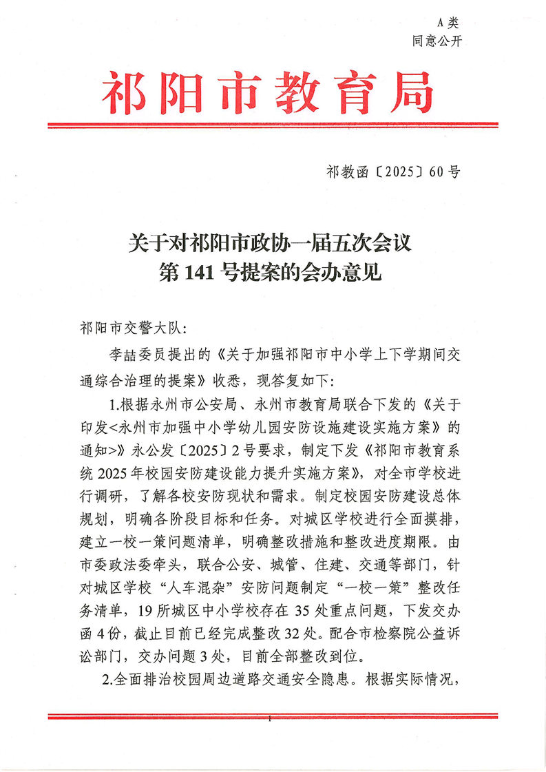 祁教函[2025]60号 关于对祁阳市政协一届五次会议第141号提案的会办意见