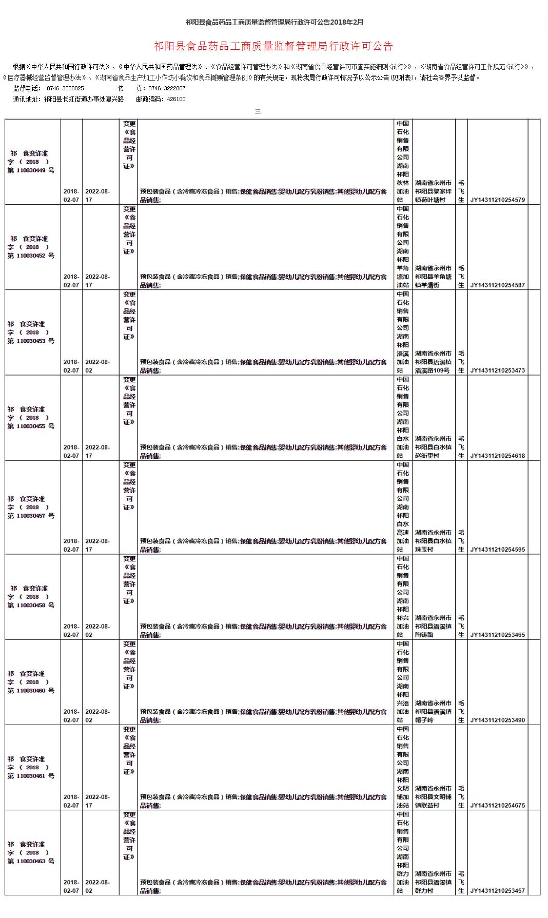 祁阳县食品药品工商质量监督管理局行政许可公告2018年2月 (三)