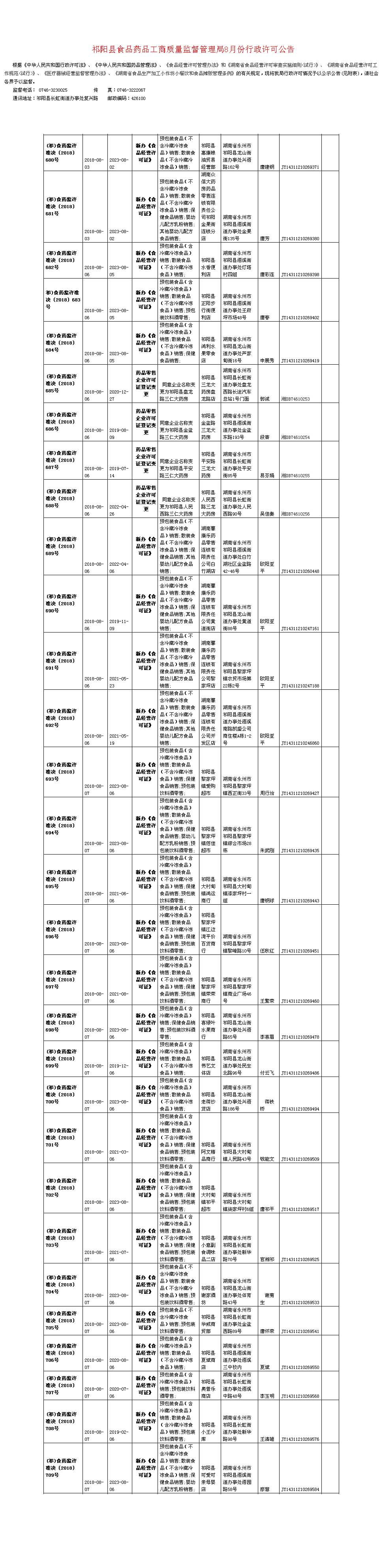 祁阳县食品药品工商质量监督管理局8月份行政许可公告 二
