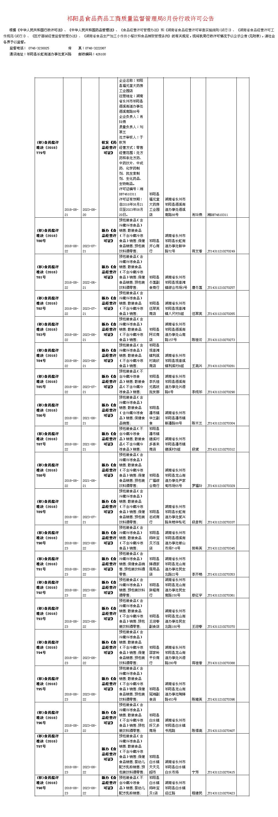 祁阳县食品药品工商质量监督管理局8月份行政许可公告 五