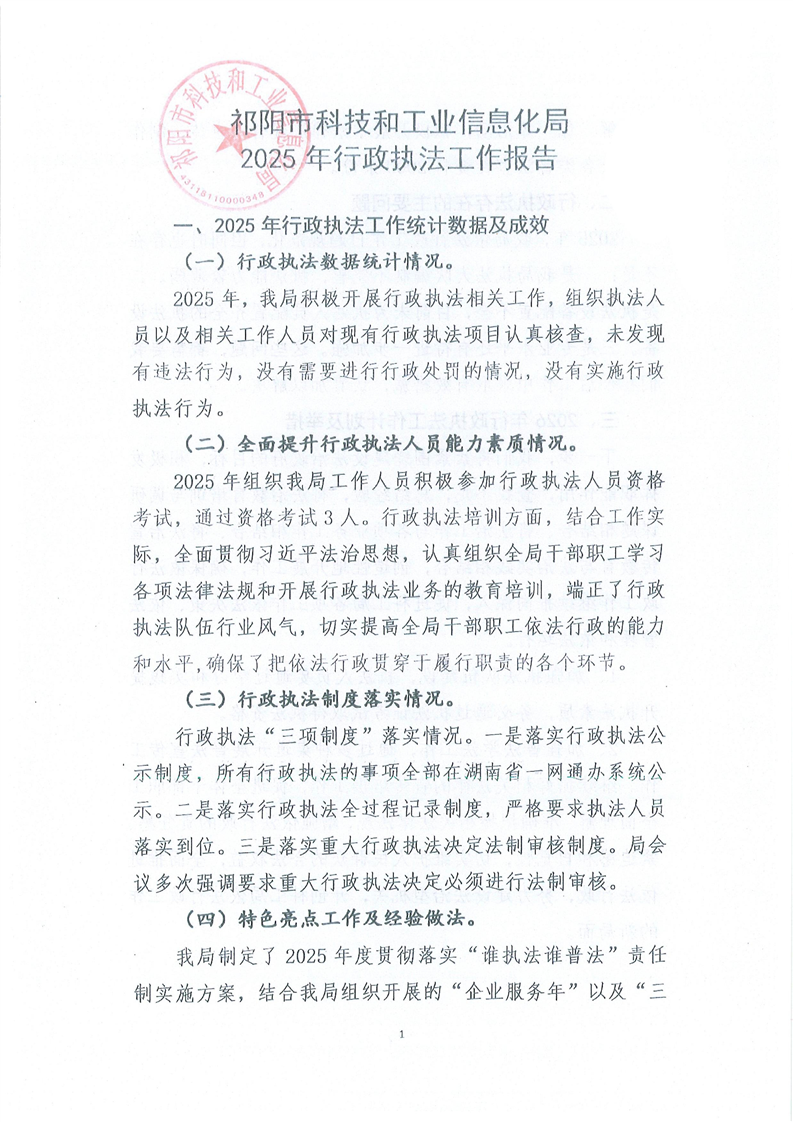 祁阳市科技和工业信息化局2025年行政执法工作报告