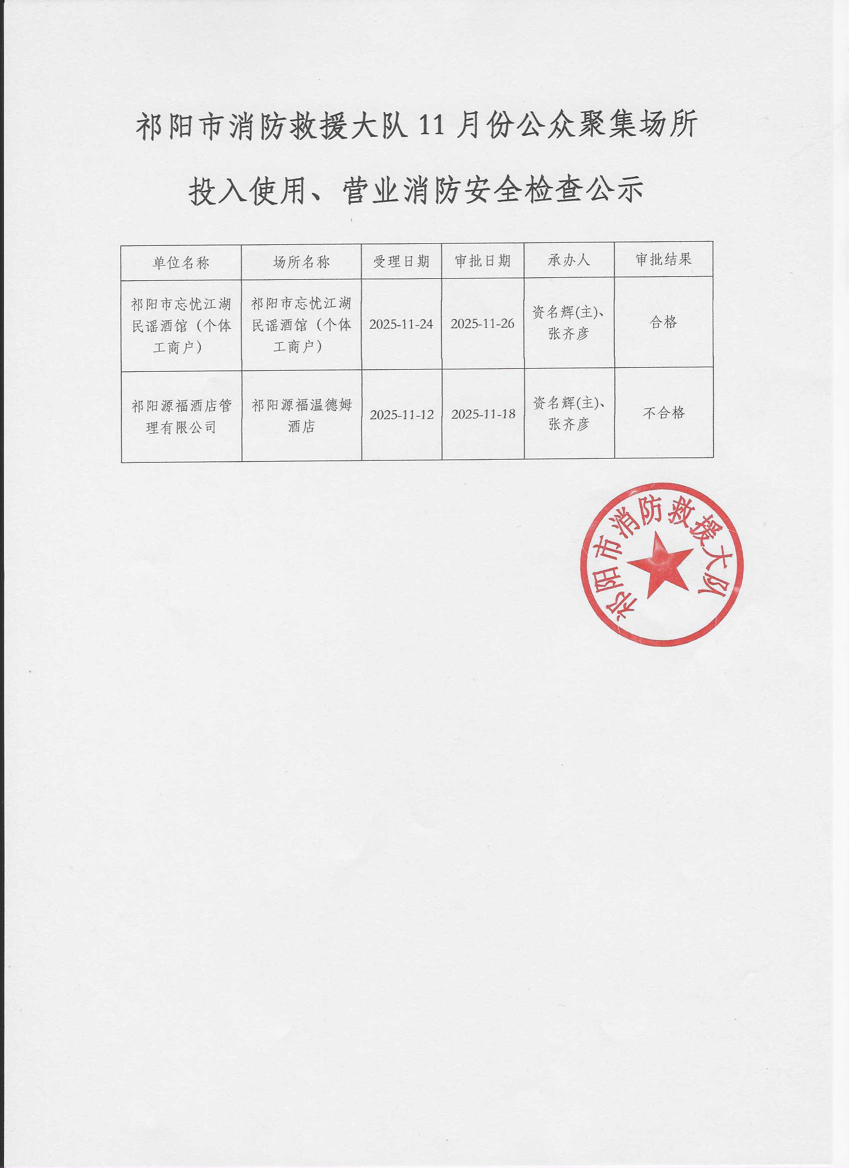 祁阳市消防救援大队11月份公众聚集场所投入使用、营业消防安全检查公示