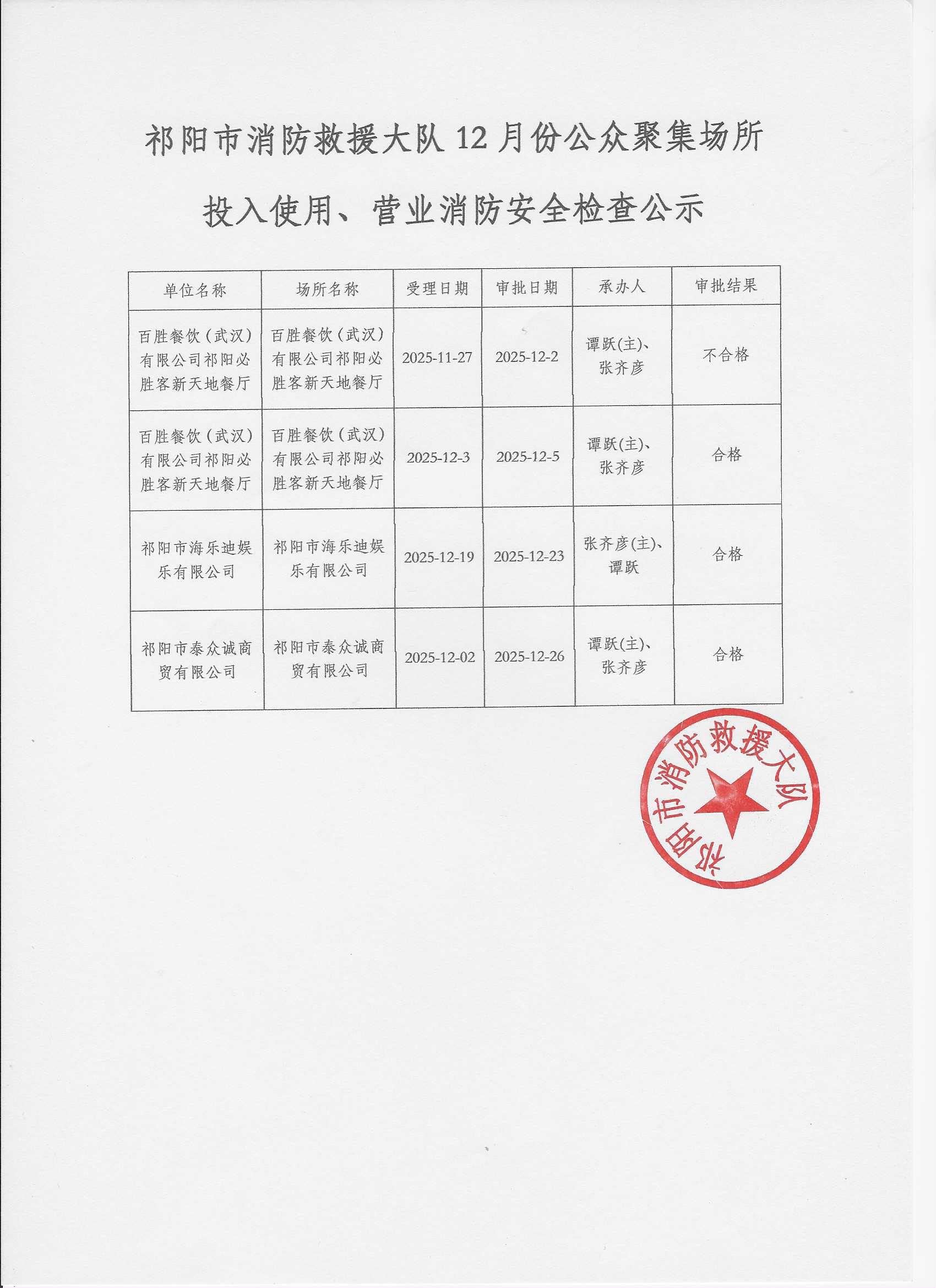 祁阳市消防救援大队12月份公众聚集场所投入使用、营业消防安全检查公示