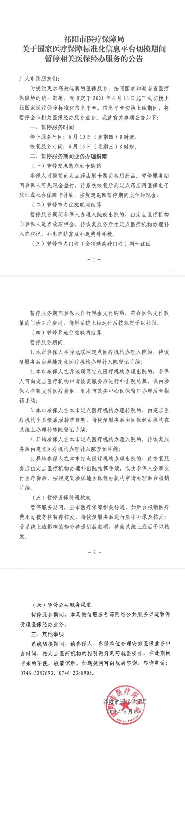 祁阳市医疗保障局关于国家医疗保障标准化信息平台切换期间暂停相关医保经办服务的公告