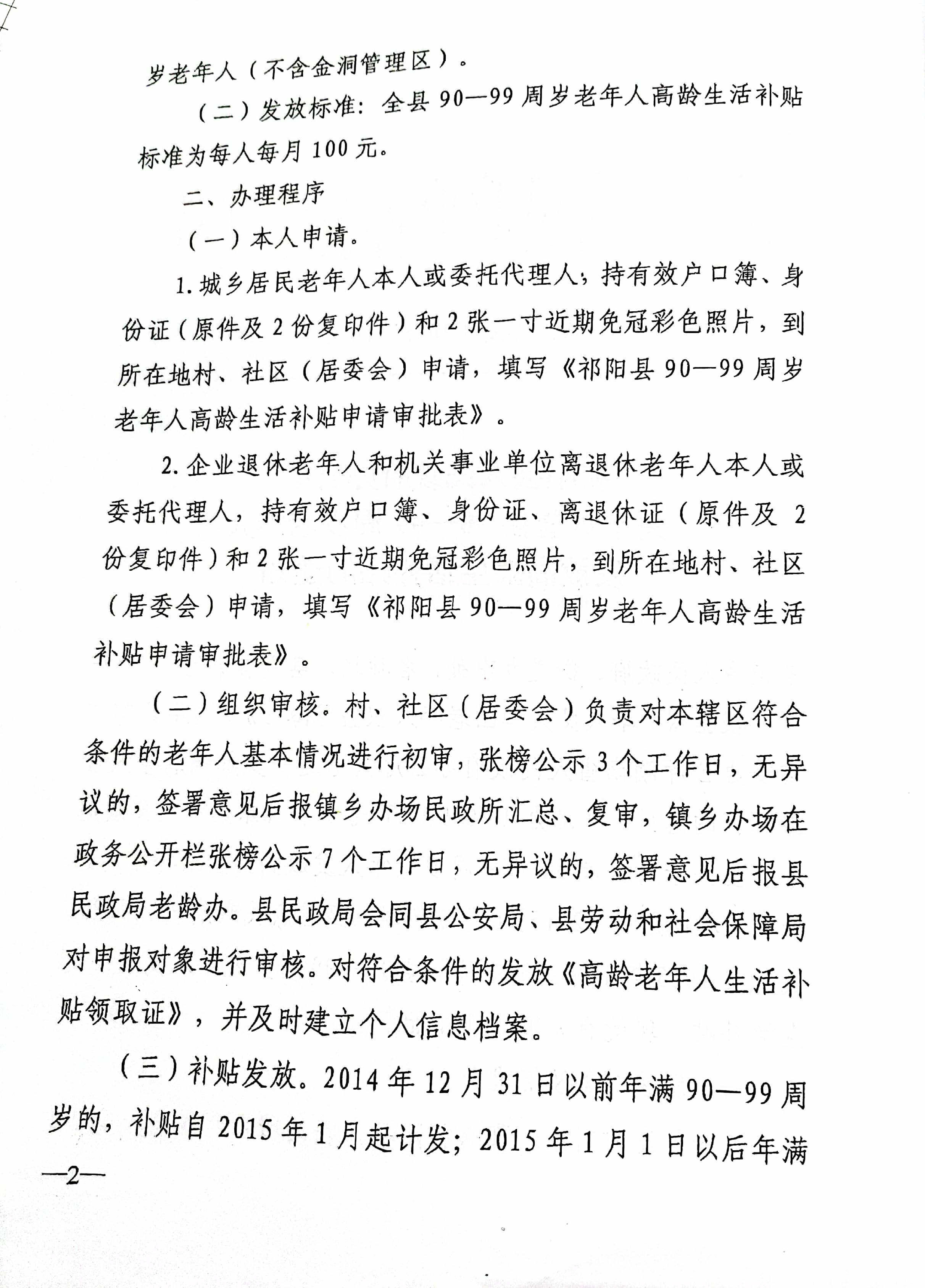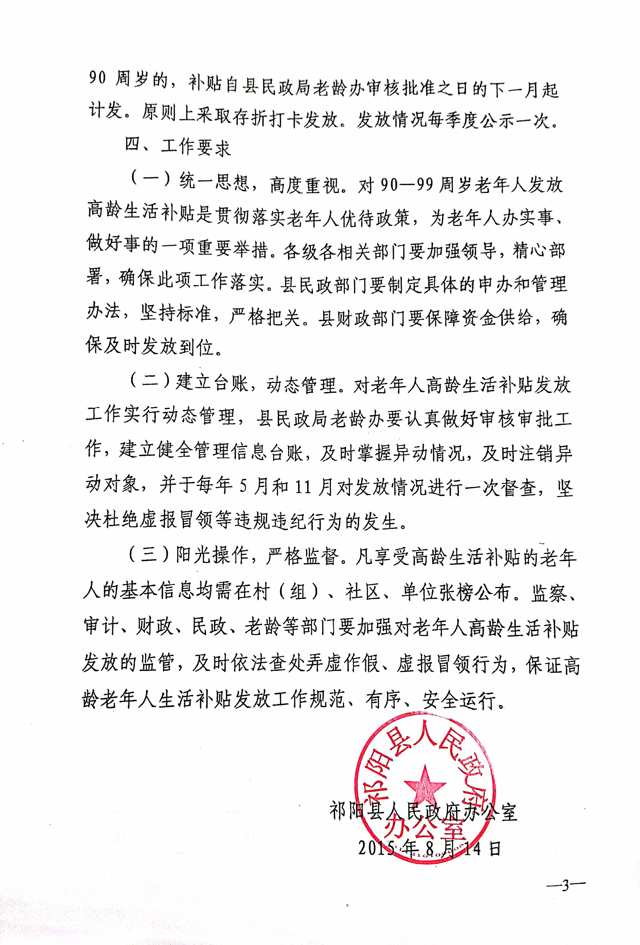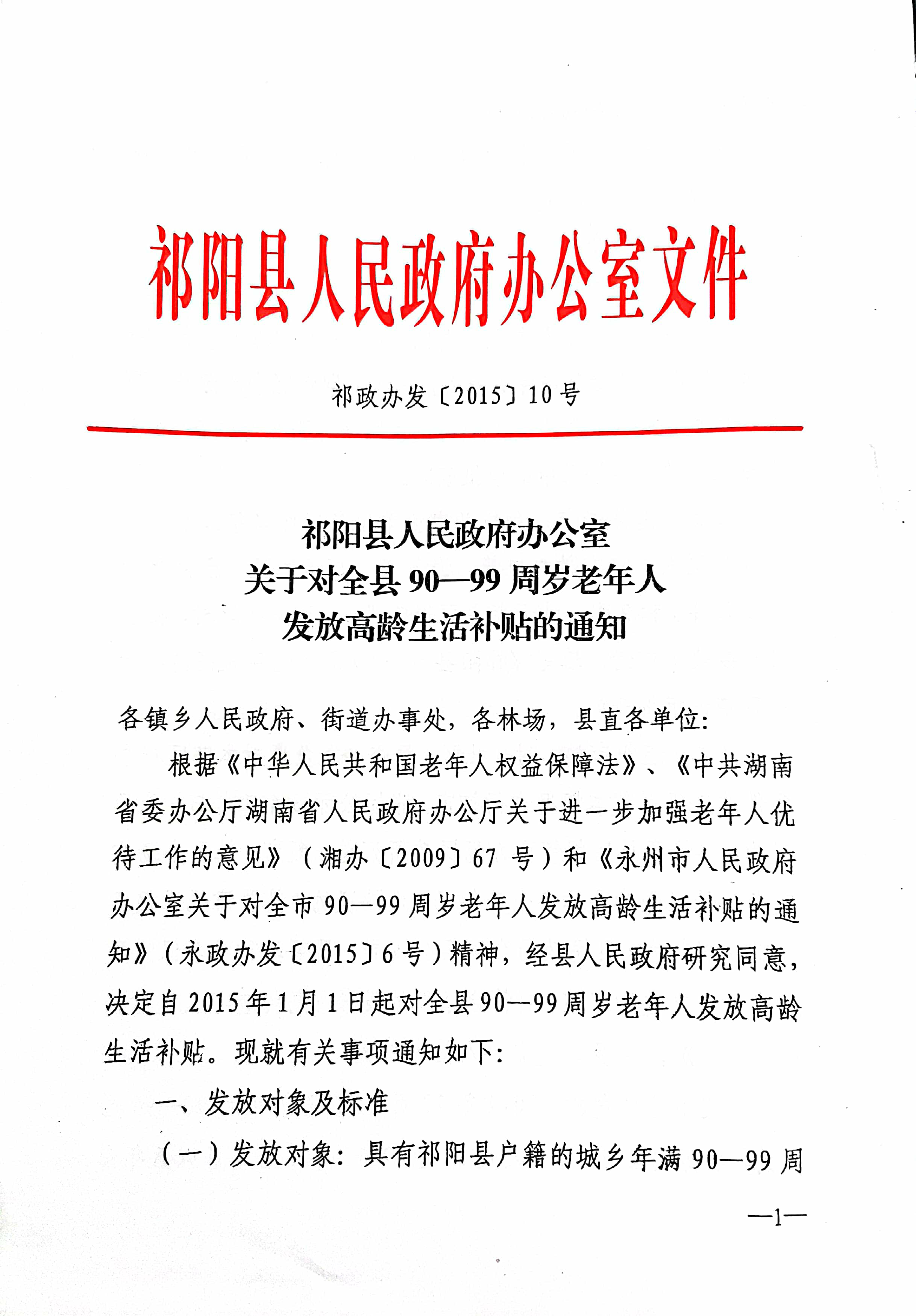 祁阳县人民政府办公室关于全县90-99周岁老年人发放高龄生活补贴的通知
