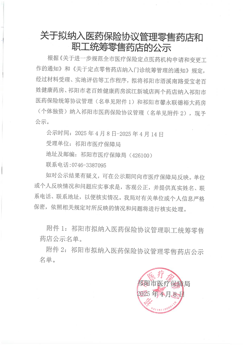 关于拟纳入医药保险协议管理零售药店和职工统筹零售药店的公示