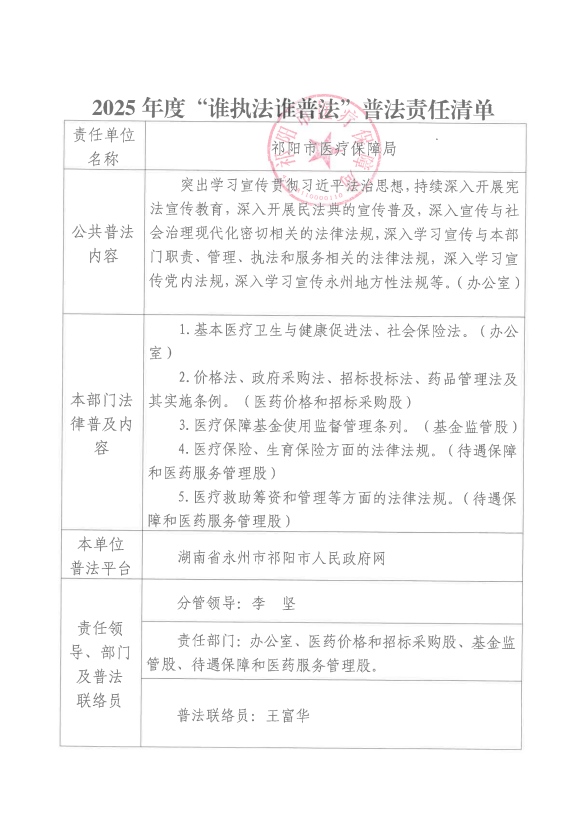 2025年度祁阳市医疗保障局“谁执法谁普法”普法责任清单