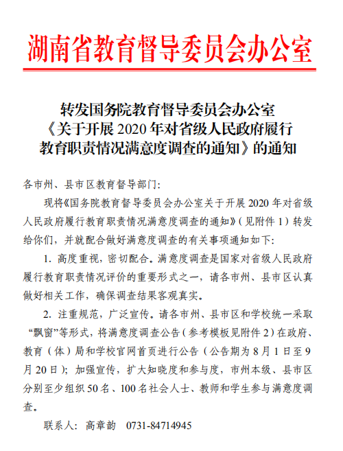 转发国务院教育督导委员会办公室《关于开展2020年对省级人民政府履行教育职责情况满意度调查的通知》的通知