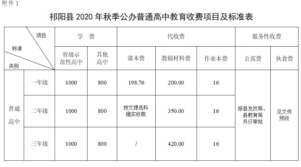 附件:1.祁阳县2020年秋季公办普通高中教育收费项目及标准表