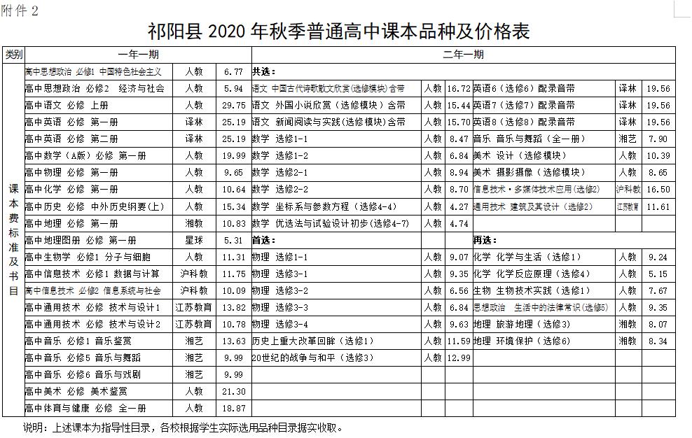 2.祁阳县2020年秋季普通高中课本品种及价格表