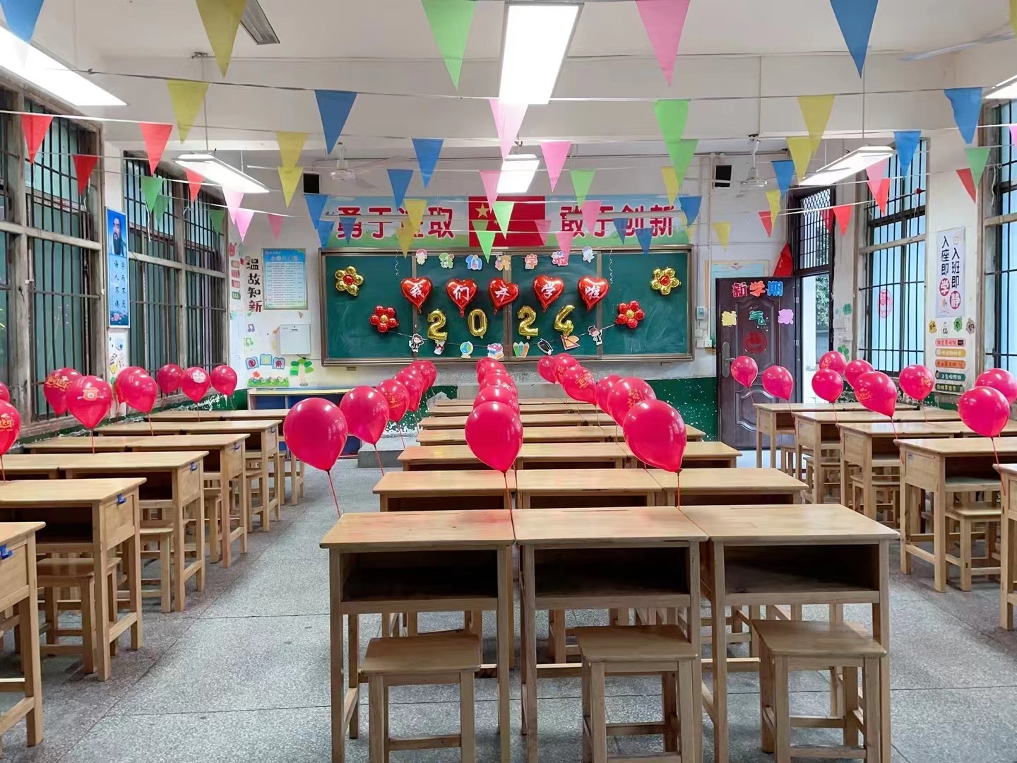 走进祁阳市潘市红军学校,黑板上书写着“我们开学啦!”校园内“欢迎新同学,新学期新气象”等标语,传递着学校对新生的关爱和期望;课桌上摆放着崭新的教材与安全手册五彩气球插在课桌上,仿佛在告诉我们,新的学期将充满无限的希望和活力。