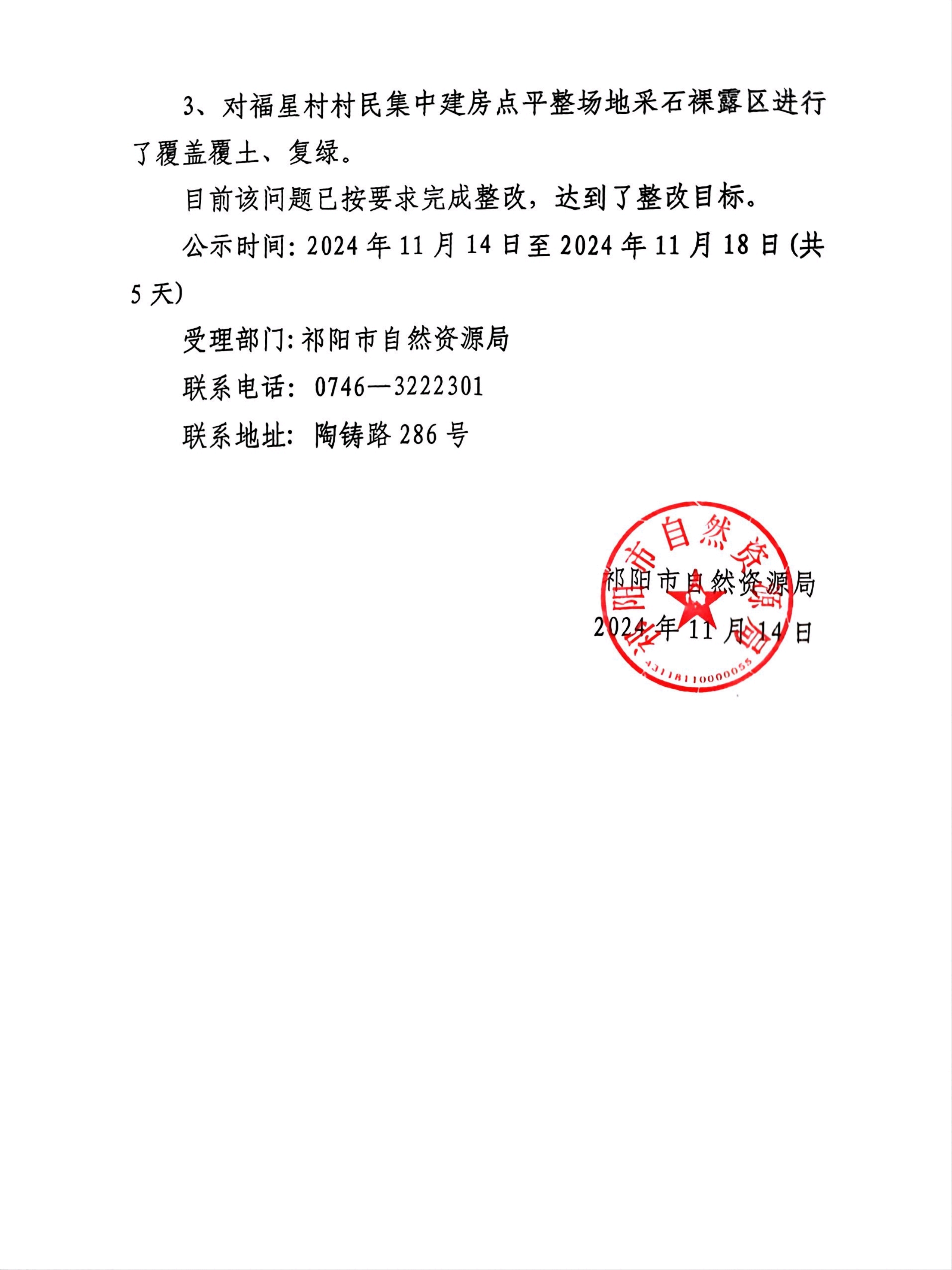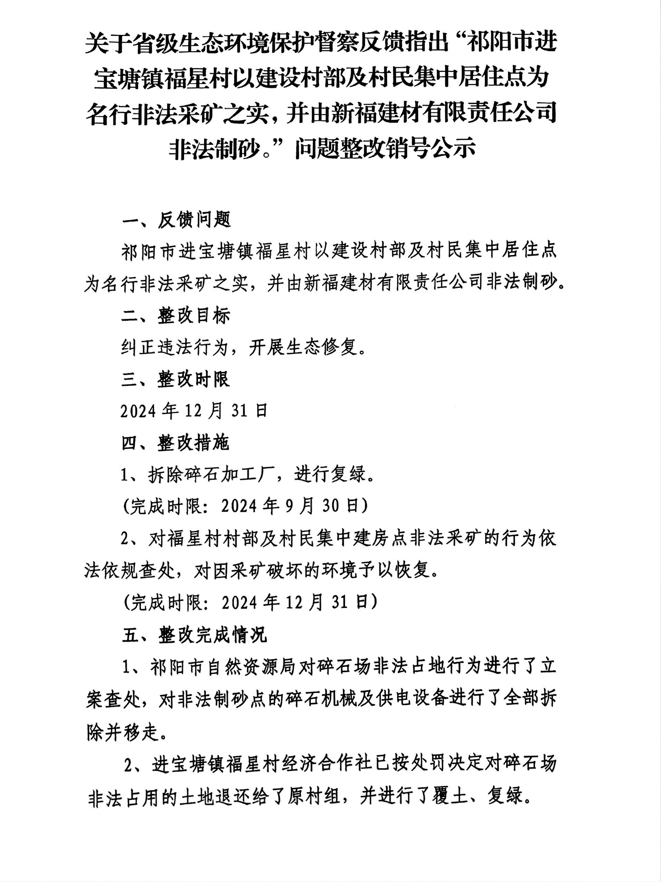 关于省级生态环境保护督察反馈指出“祁阳市进宝塘镇福星村以建设村部及村民集中居住点为名行非法采矿之实,并由新福建材有限责任公司非法制砂。”问题整改销号公示