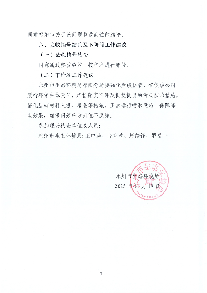 关于“永州市祁阳市润天公司厂区后方矿石矿粉等原辅材料均露天堆放等环境问题”问题验收销号意见