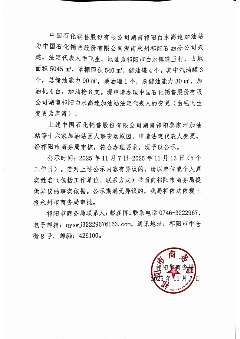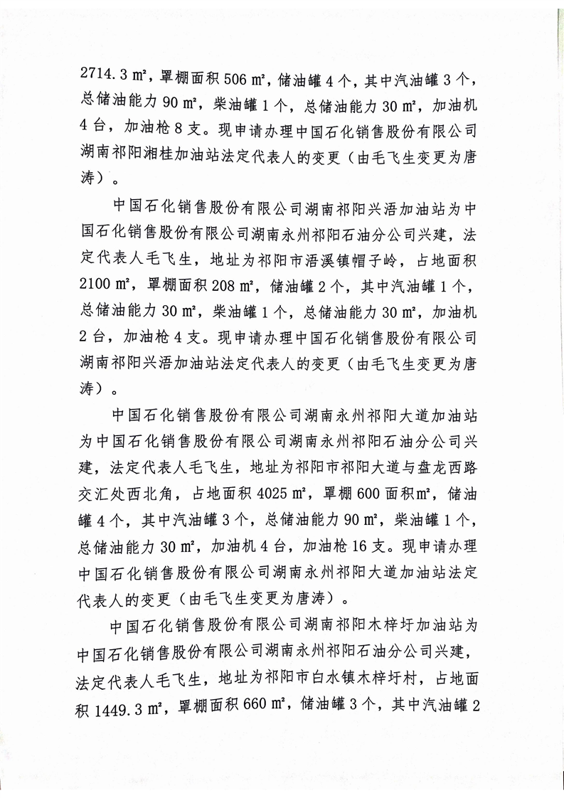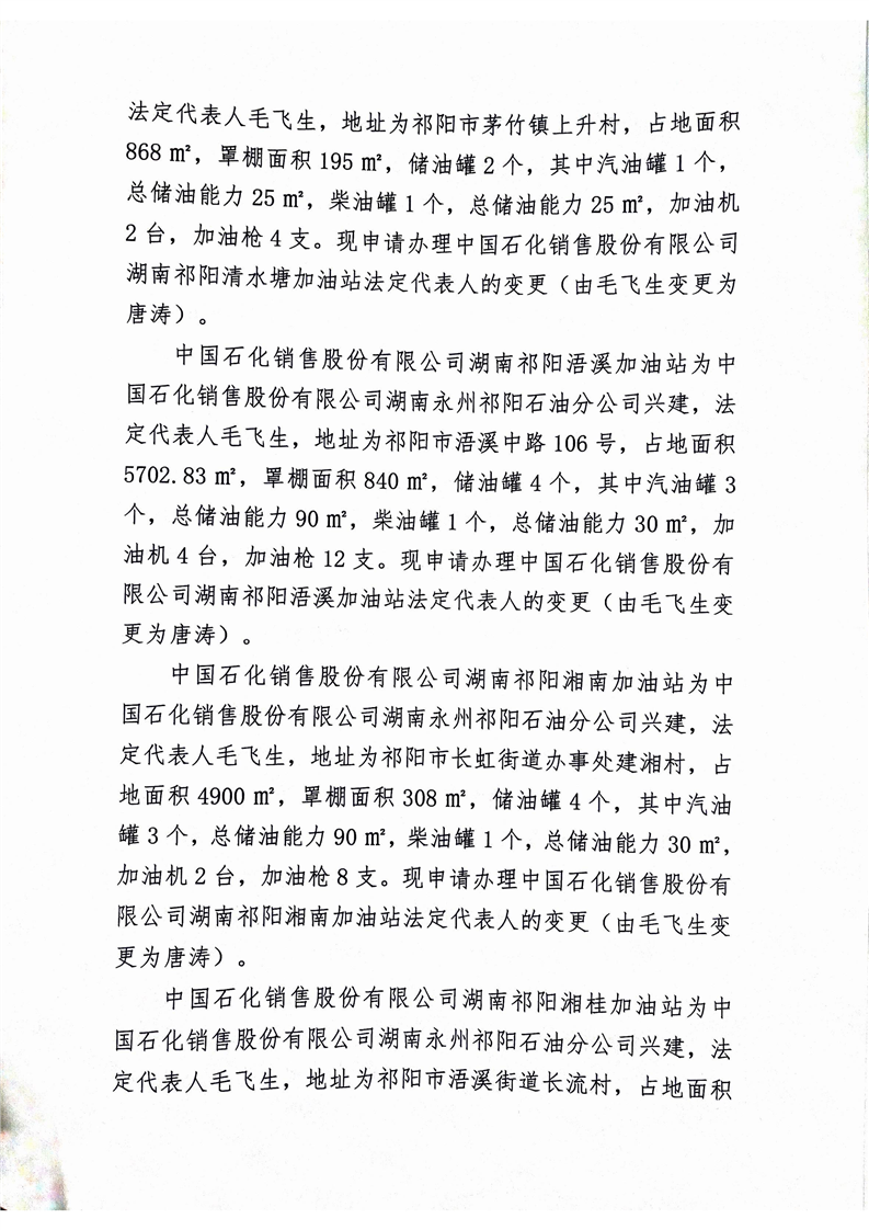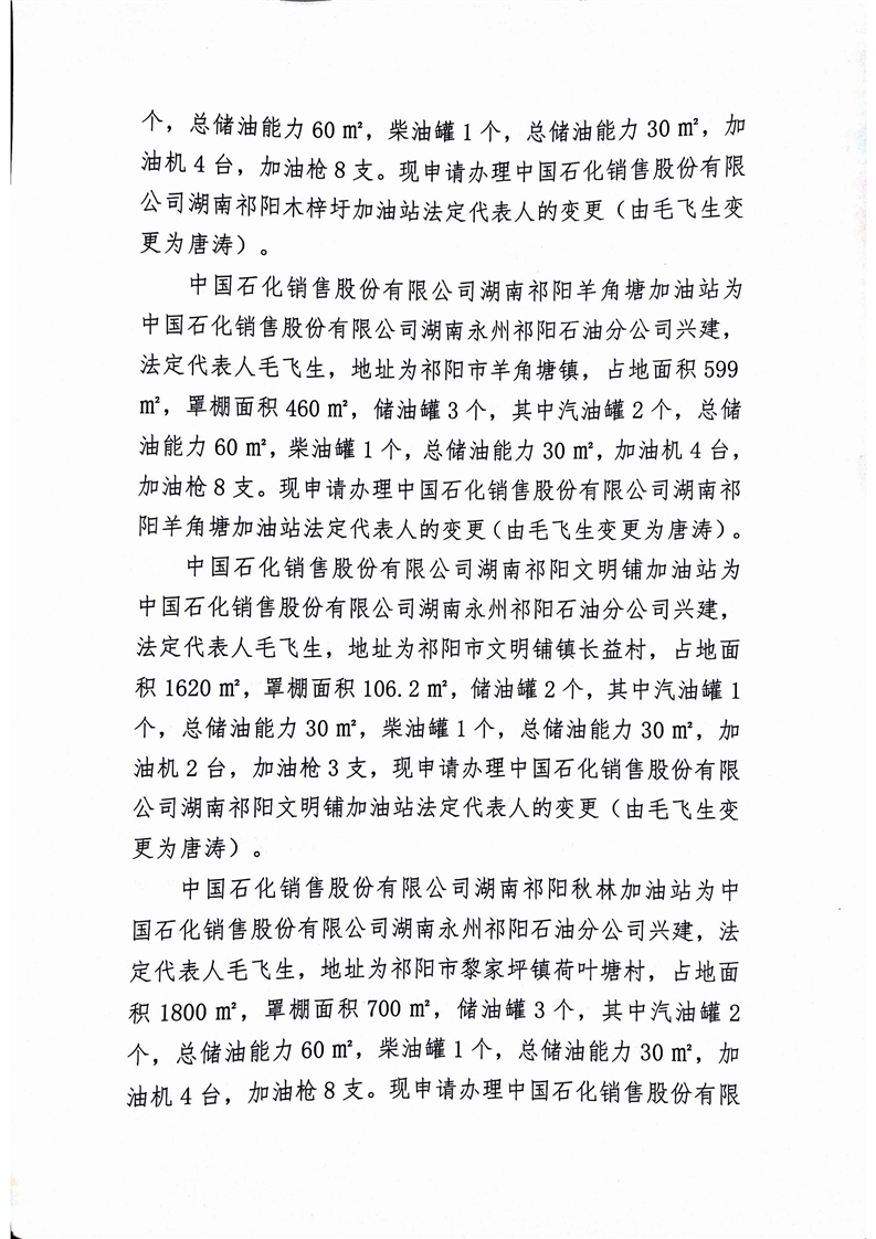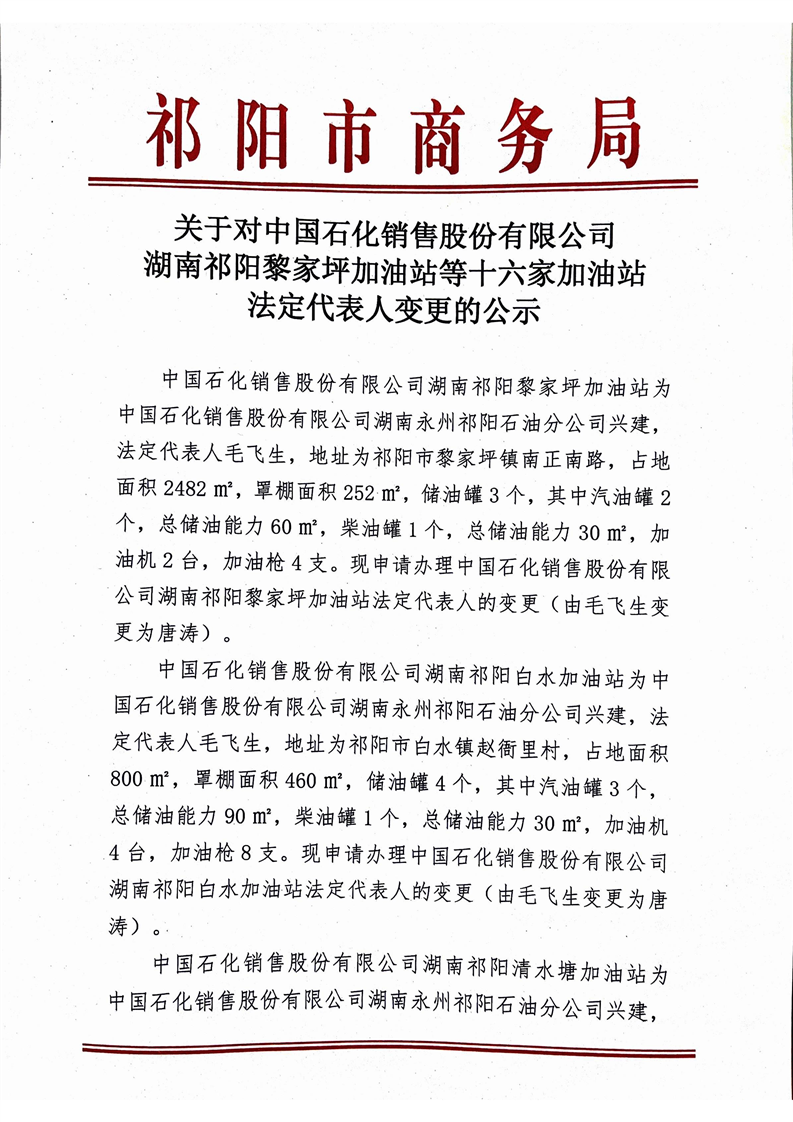 关于对中国石化销售股份有限公司湖南祁阳黎家坪加油站等十六家加油站法定代表人变更的公示