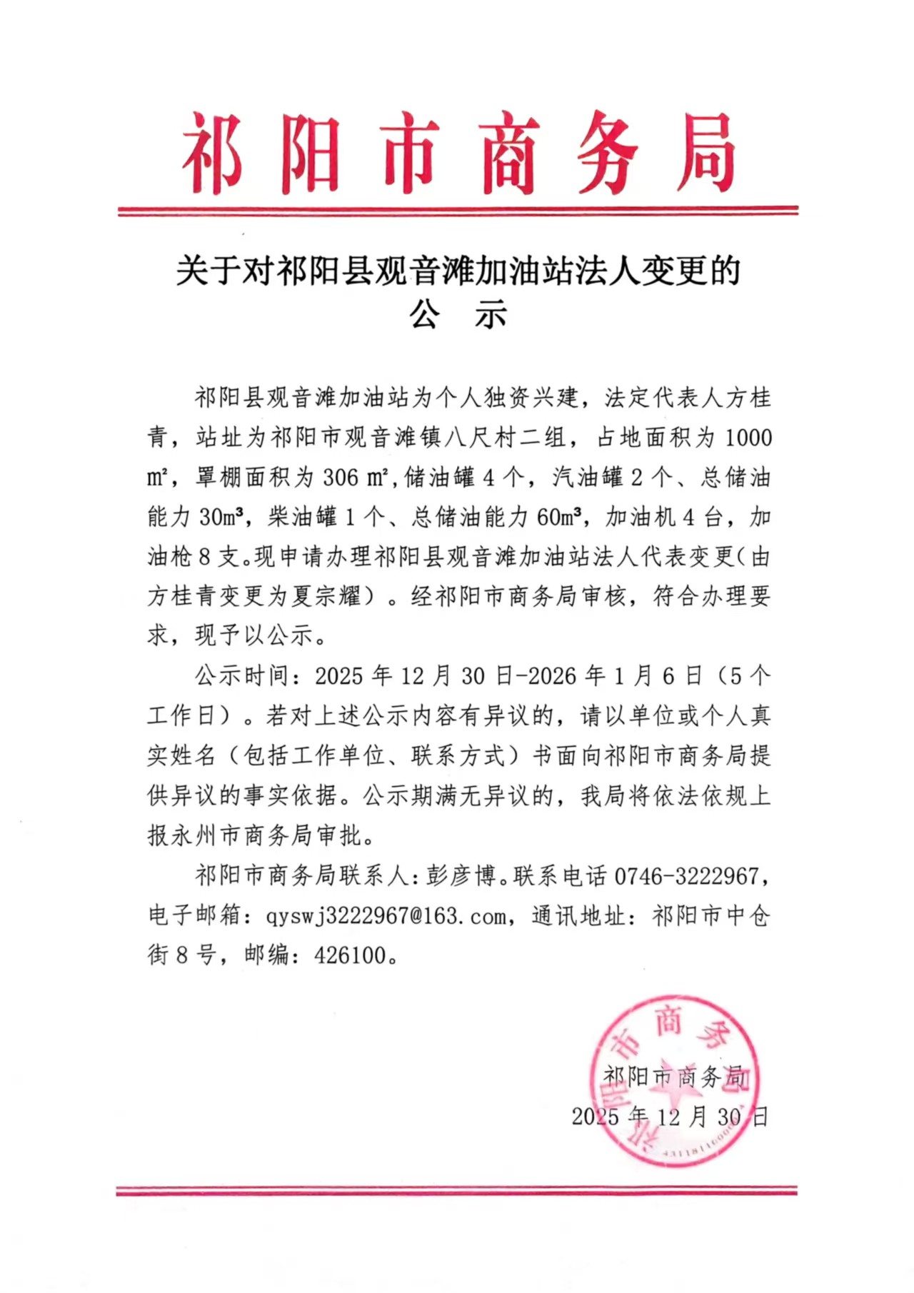 关于对祁阳县观音滩加油站法人代表变更的公示