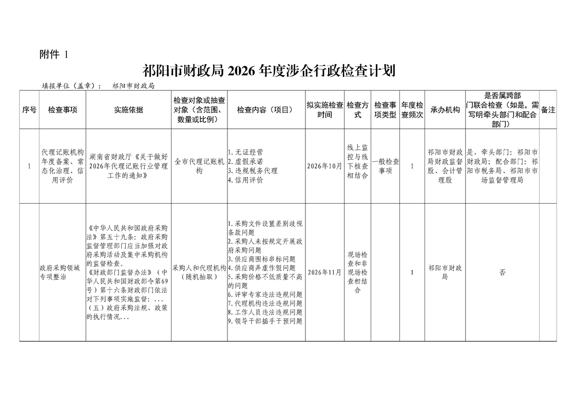 祁阳市财政局2026 年度涉企行政检查计划
