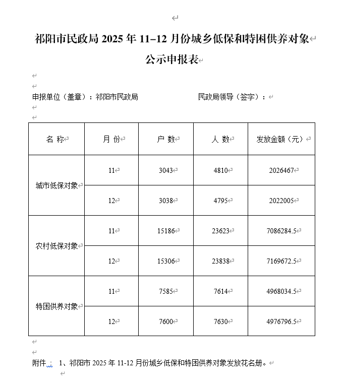 祁阳市民政局2025年11-12月份城乡低保和特困供养对象公示申报表