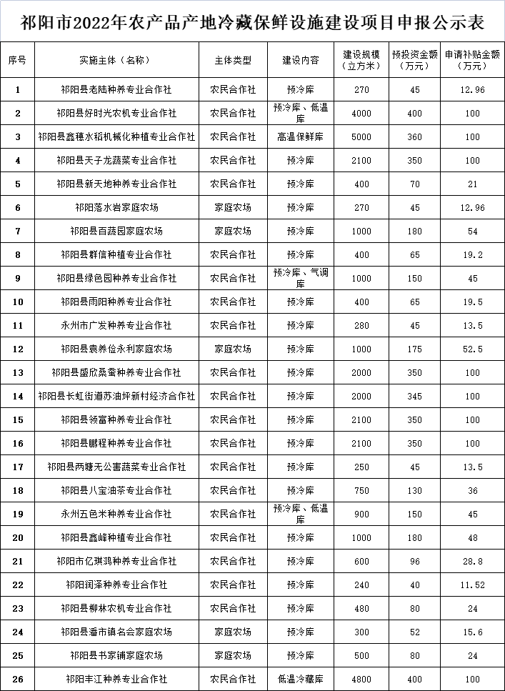 根据湖南省农业农村厅、湖南省财政厅《2022年农产品产地冷藏保鲜设施建设实施方案》(湘农联〔2022〕50号)及祁阳市农业农村局、祁阳市财政局《祁阳市2022年农产品产地冷藏保鲜设施建设实施方案》(祁农联〔2022〕9号)文件精神,经我局组织遴选,现将符合农产品产地冷藏保鲜设施建设项目申报条件的新型经营主体及申报信息予以公示(见附件),接受社会各界监督。