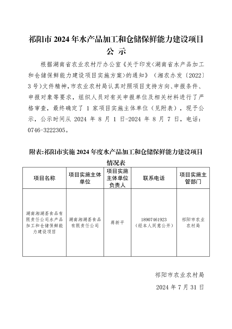 祁阳市2024年水产品加工和仓储保鲜能力建设项目公 示