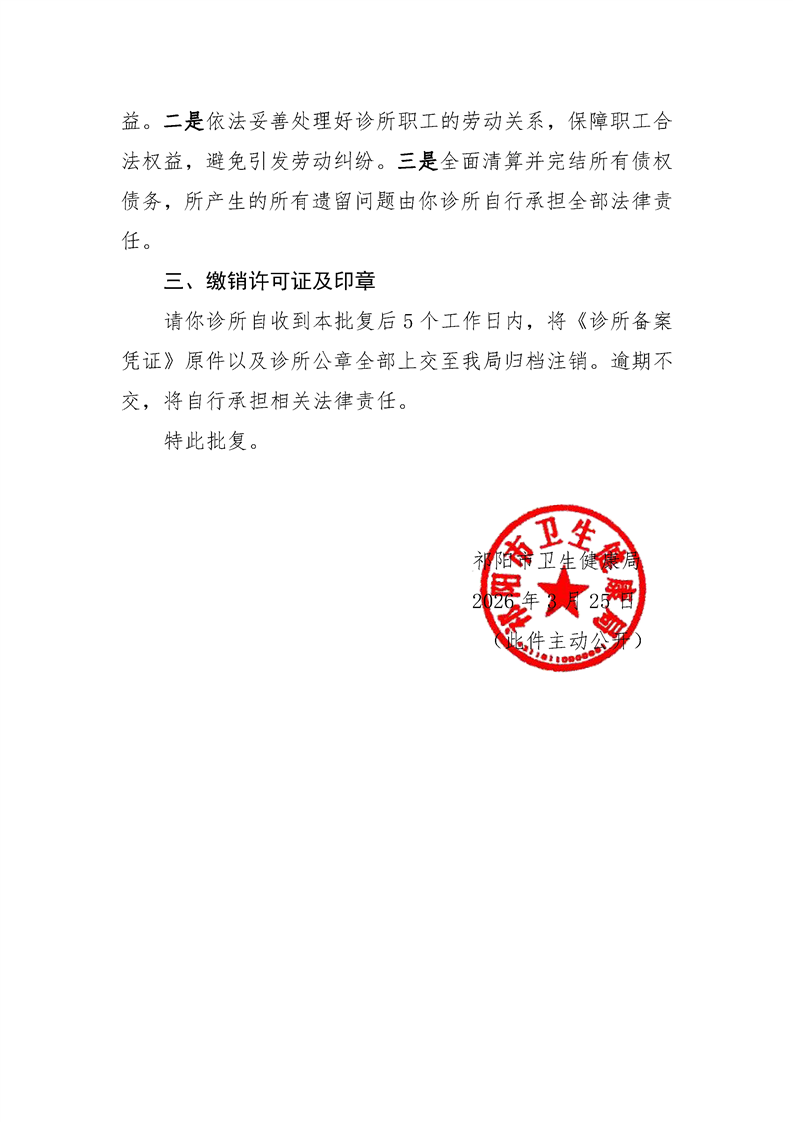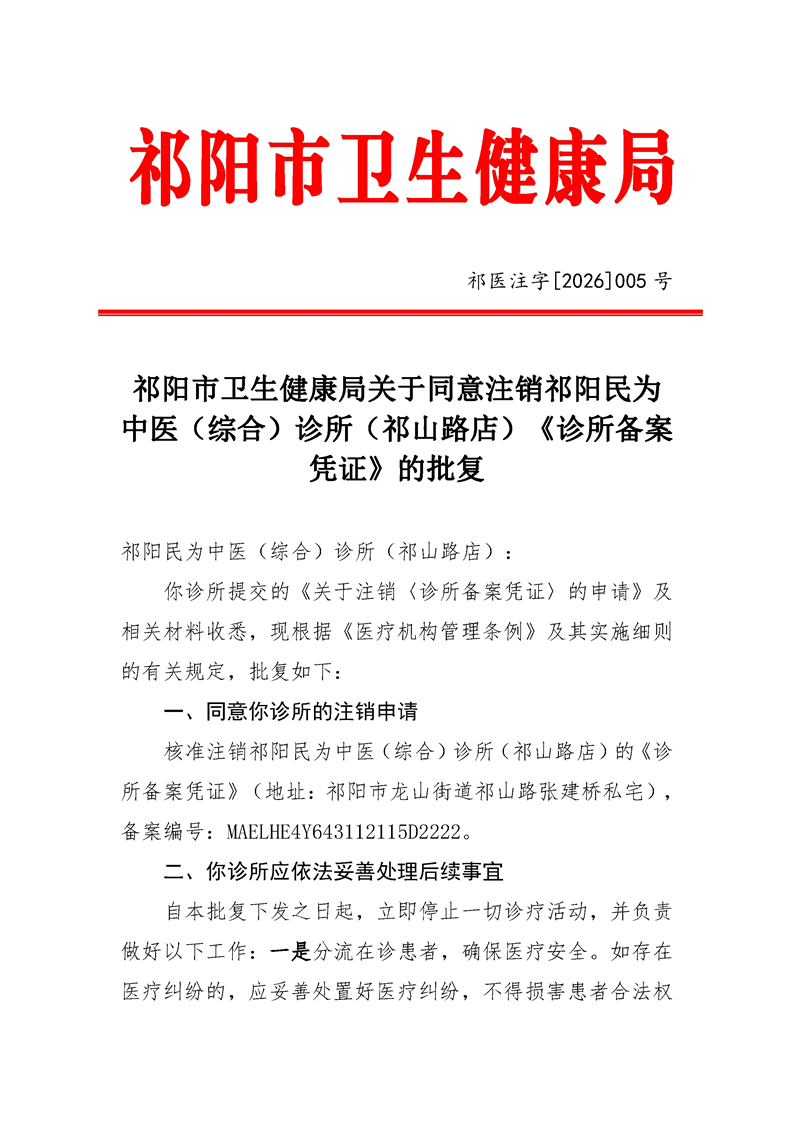 祁阳市卫生健康局关于同意注销祁阳民为中医(综合)诊所(祁山路店)《诊所备案凭证》的批复