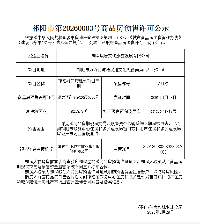 祁阳市第20260003号商品房预售许可公示