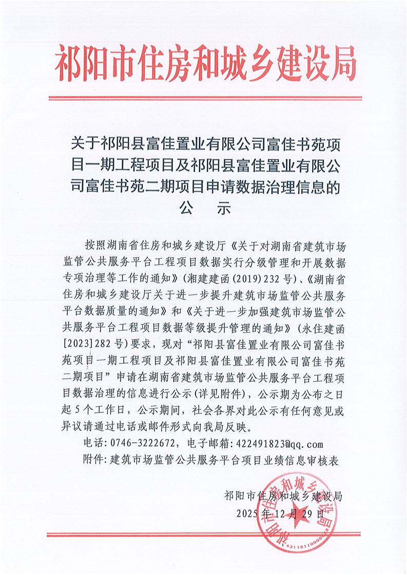 关于祁阳县富佳置业有限公司富佳书苑项目一期工程项目及祁阳县富佳置业有限公司富佳书苑二期项目申请数据治理信息的公示