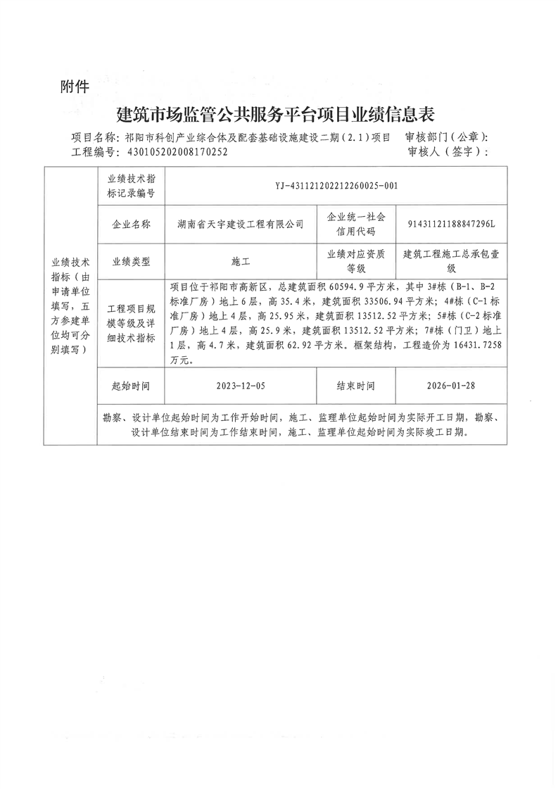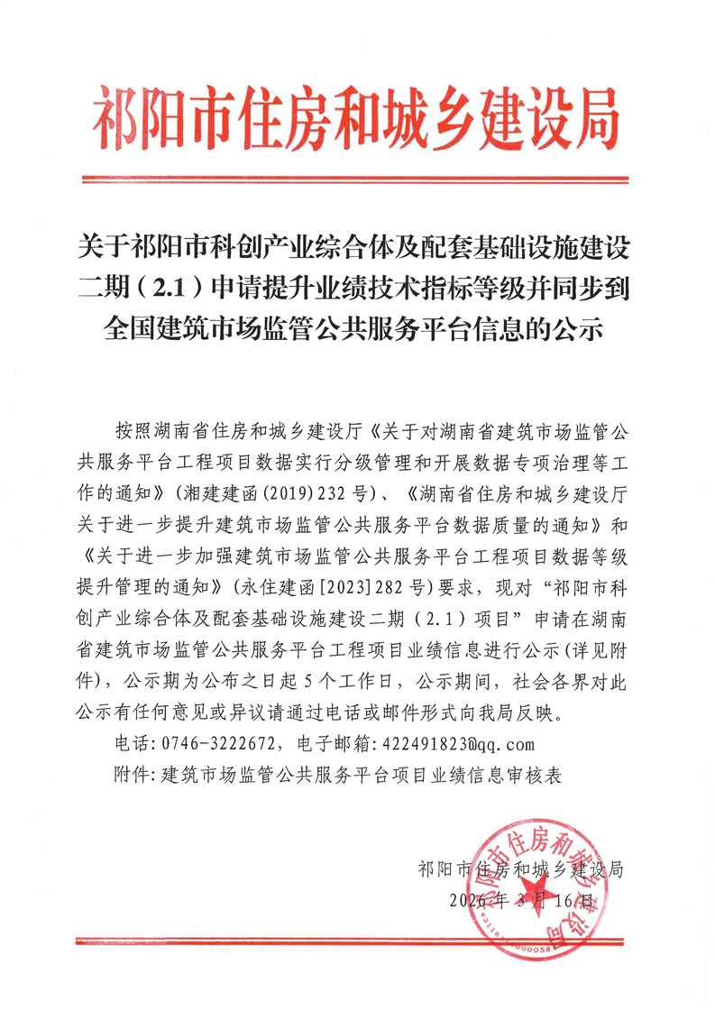 关于祁阳市科创产业综合体及配套基础设施建设二期(2.1)申请提升业绩技术指标等级并同步到全国建筑市场监管公共服务平台信息的公示